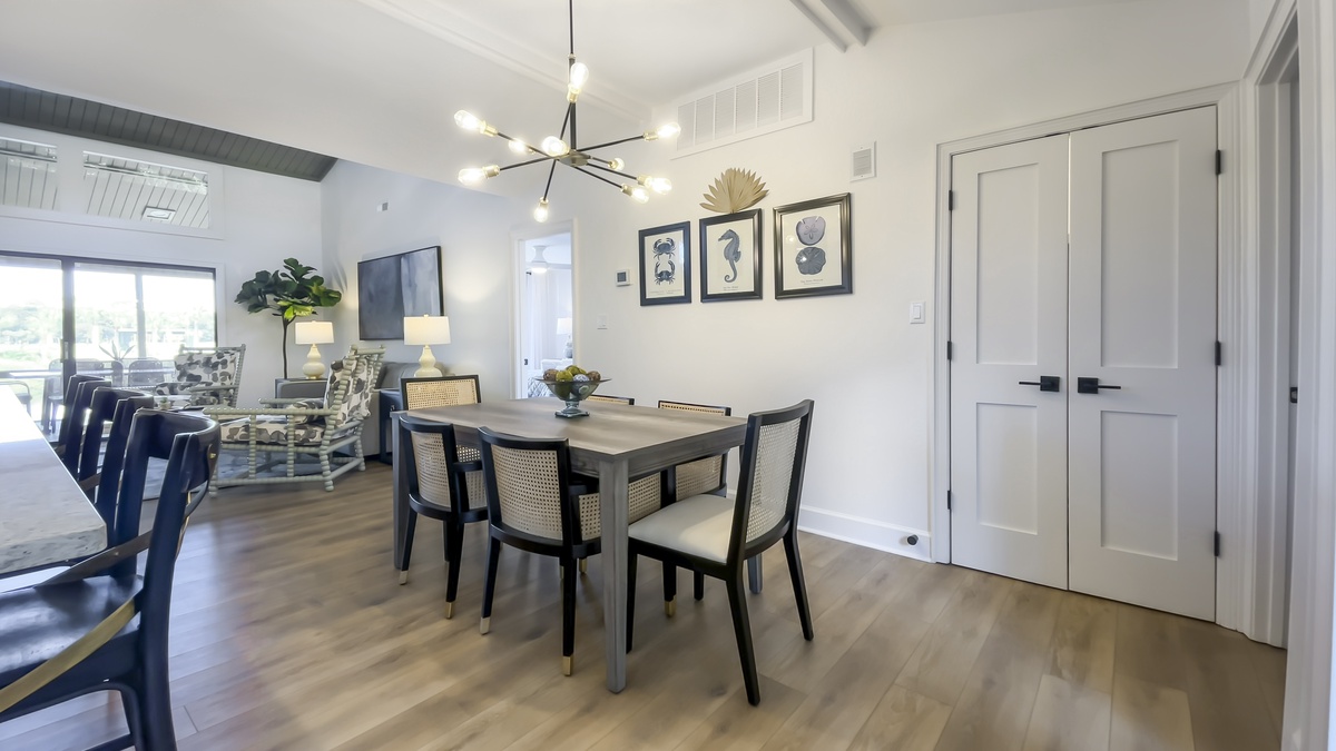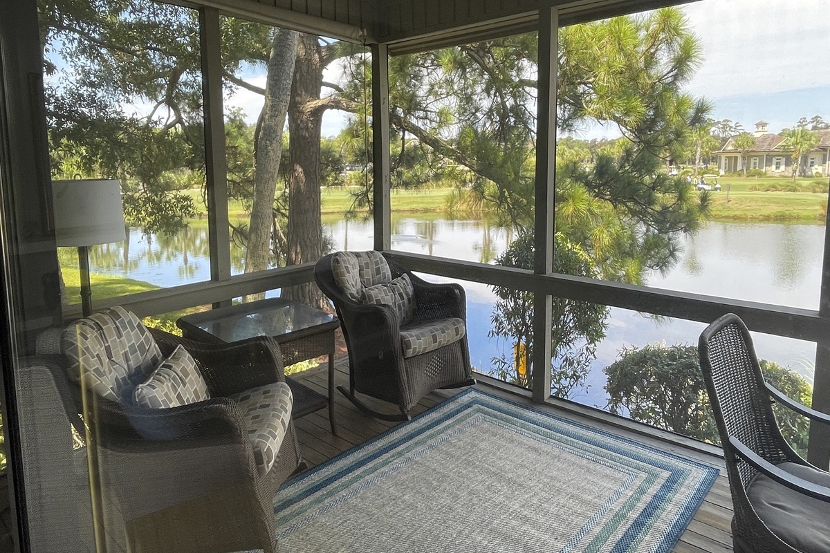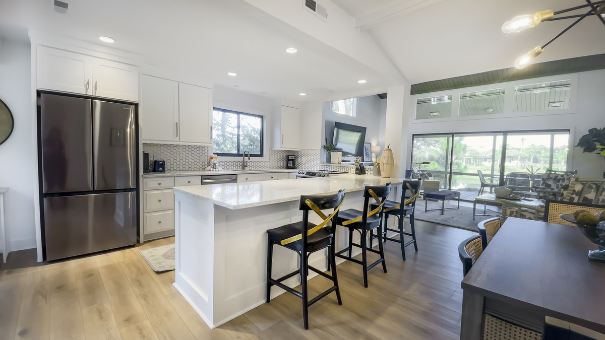 The wide rear patio offers the best golf views, a screened-in paradise offering al fresco dining for six and panoramic views of gold and waterways. Just inside, a lofty great room sees a soaring vaulted ceiling allowing blissful natural light to illuminate a space with sofa, plentiful seating and flat-screen TV. Moving inward, we find a farmhouse-style table offering dining for six beside the wide granite counter of the elegant kitchen. Boasting updated finishes and stainless-steel appliances, even the kitchen enjoys views out to the course.