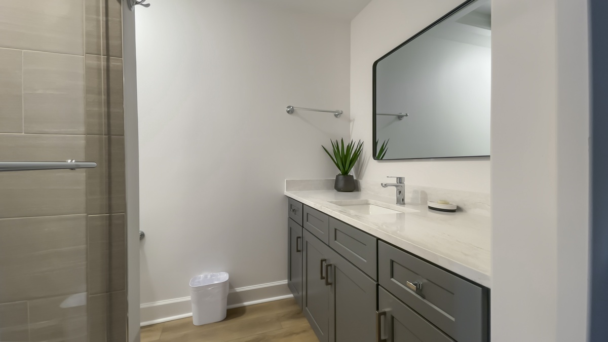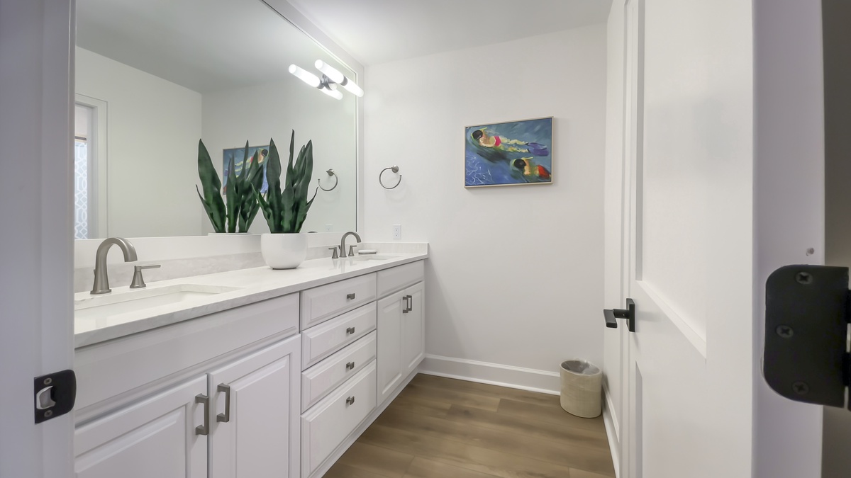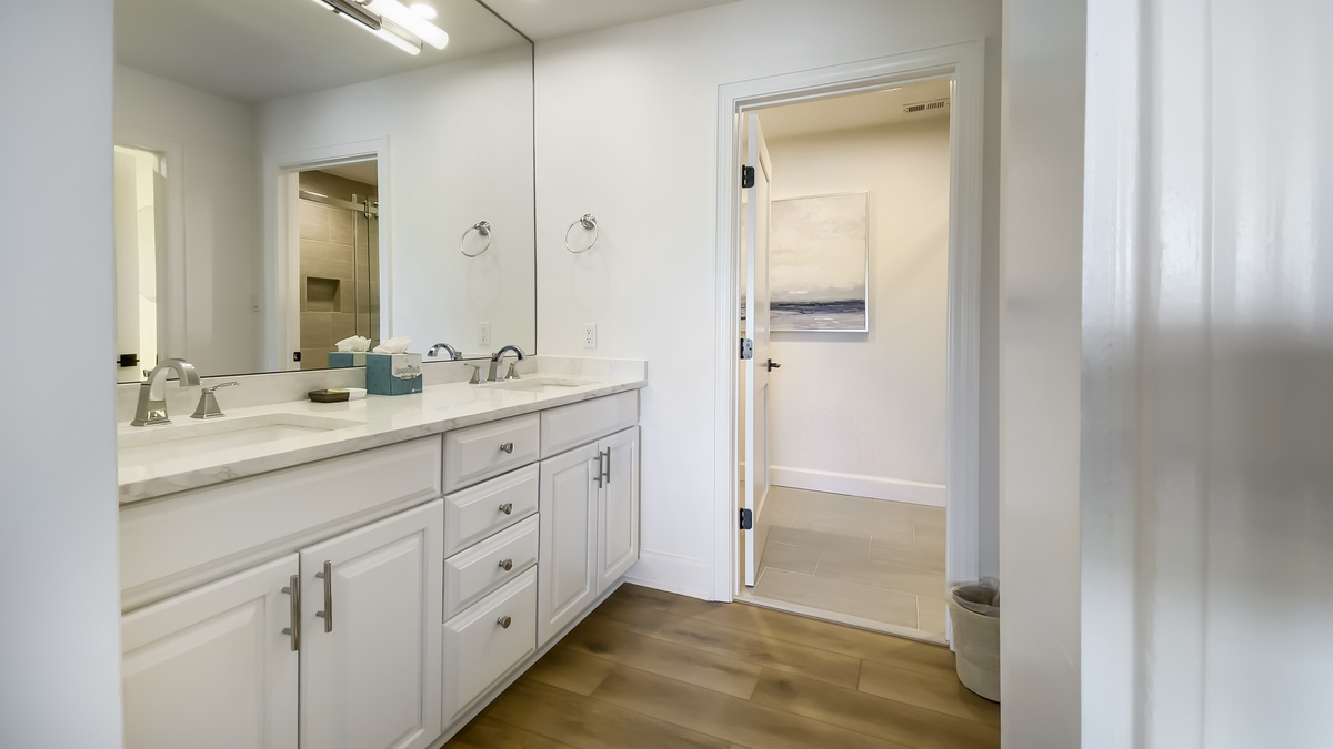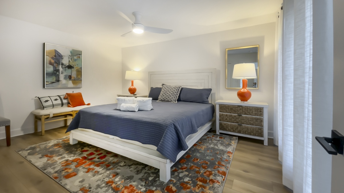 Making a grand statement with its striking board-and-batten accent wall, the owner suite indulges with resort-style amenities including private access via sliders to a rear patio, king size, ceiling fan, flat-screen TV and en suite bath with dual-basin vanity and walk-in shower.