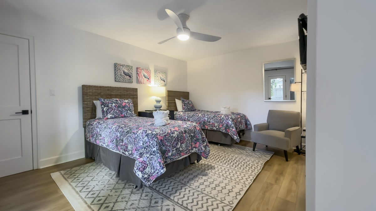The main courtyard offers a unique way to enjoy indoor and outdoor living, with nearby outdoor shower and doors that open wide to two of the lushly comfortable guest rooms. In the first, a king-size bed anchors a suite with flat-screen TV, ceiling fan and en suite set behind a wide barn door boasting walk-in shower. In the second, dual twin beds offer comfort amid a full suite with flat-screen TV and private bath boasting tub and shower. Each enjoys its own private access to the courtyard, and shared access to a full laundry with washer and dryer.
