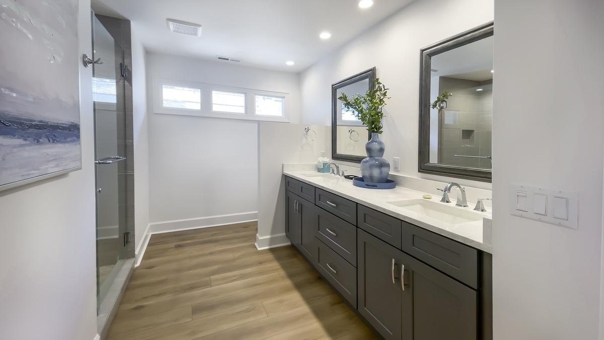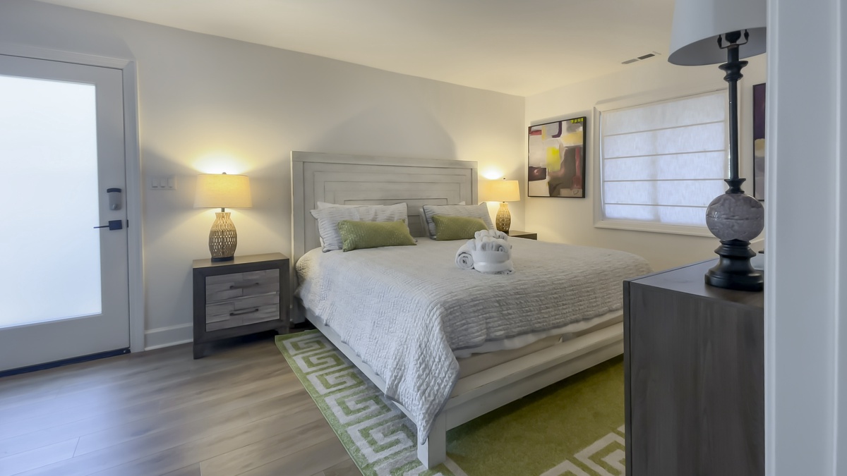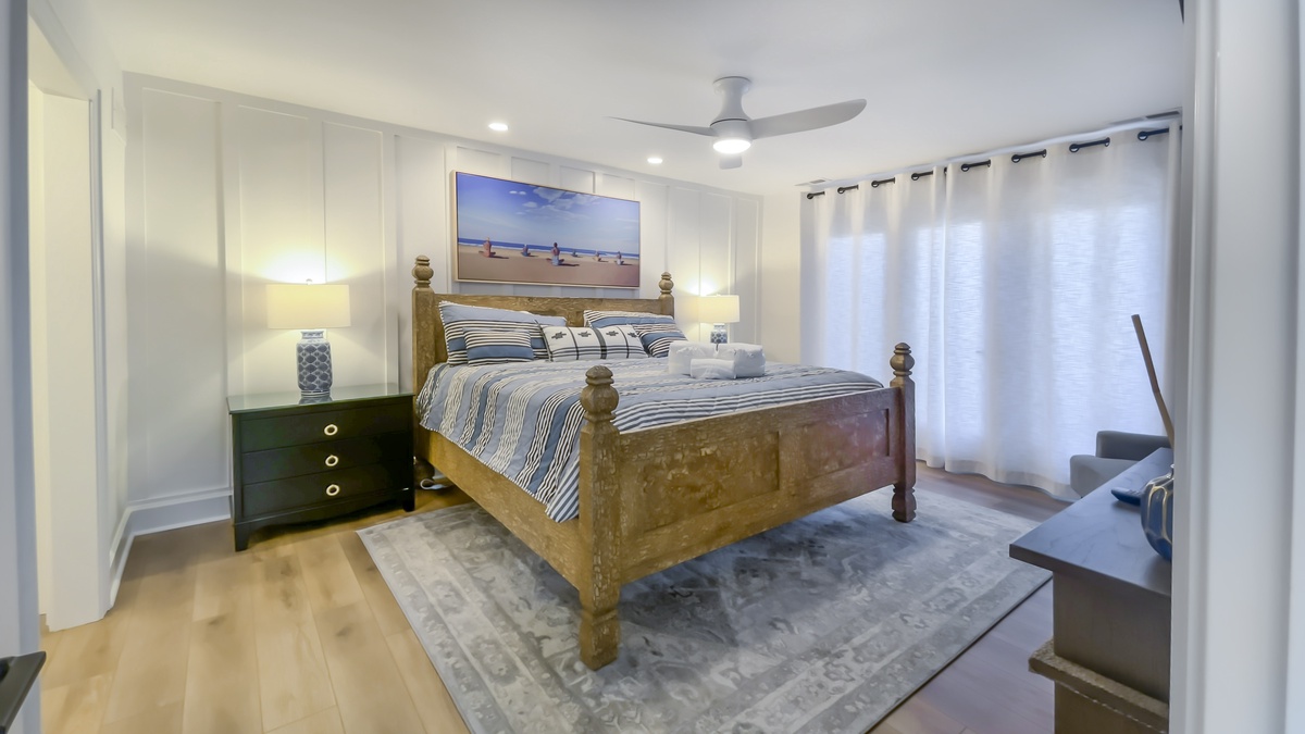 Along with access to a full laundry, this main villa boasts its own opulent owners suite, where a king-size bed rests amid a wonderfully updated space with private access to the rear patio, ceiling fan, flatscreen TV and spa-like en suite bath with dual-basin vanity and walk-in shower.