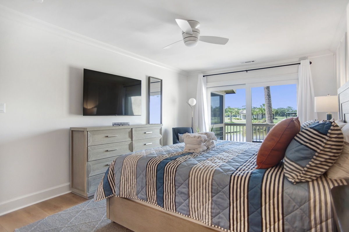 These areas flow into the expansive great room, highlighted by ceilings that soar to elevated skylights. A sleeper sofa and multiple end chairs face the wall-mounted flat-screen TV flanked by stylish objets d’art. French doors at the far end open to a screened-in patio offering al fresco dining and tranquil lagoon views.