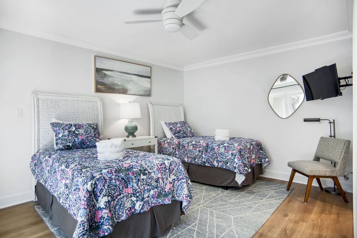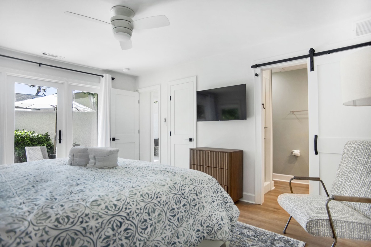 The first guest suite, enjoying abundant natural light from doors leading to a broad sundeck, sees a king-size bed set before a board-and-batten accent wall in a space with ceiling fan and en suite bath with walk-in shower. A second suite with king-size bed enjoys a flat-screen TV, French door access to the front courtyard, and en suite with walk-in shower. The third and final suite, with tub and shower in the private bath, boasts dual twin beds.