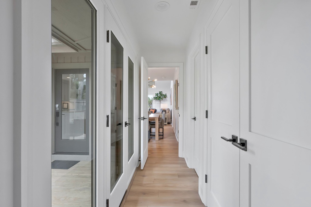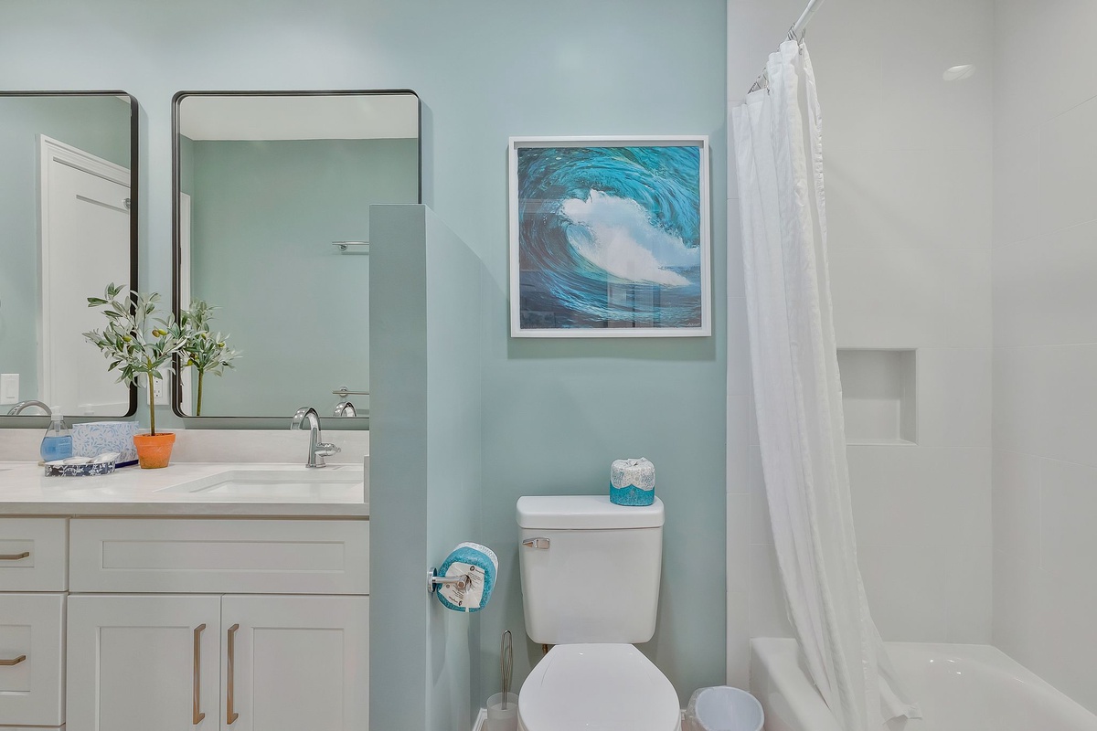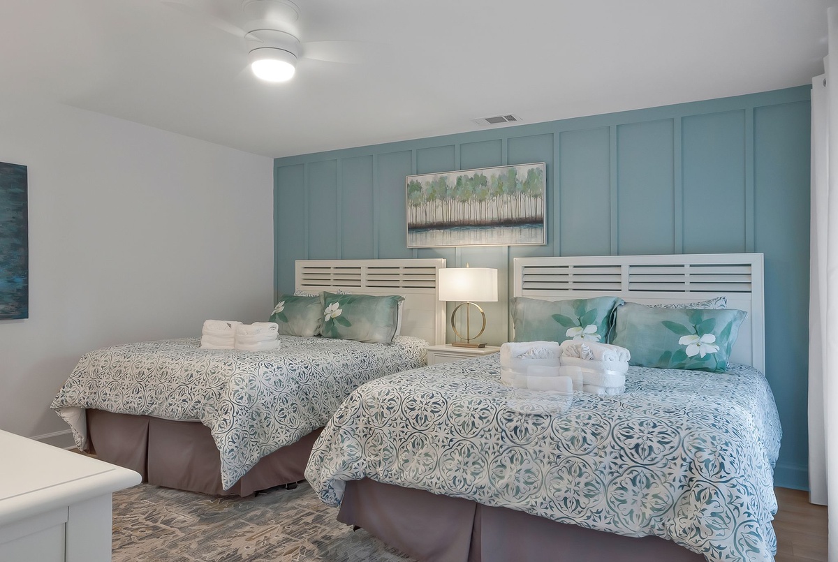 Sharing in this view, the primary suite sees a king-size bed set before an eye-catching board-and-batten accent wall in a space with ceiling fan, flat-screen TV, private access to a wide sundeck, and en suite with walk-in shower. A second guest suite pairs a king and a queen before an accent wall in a space with ceiling fan, sliding-glass access to the front courtyard, and en suite bath with tub and shower.