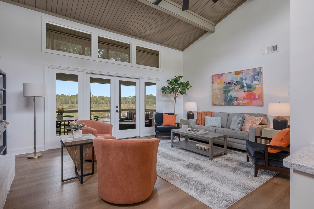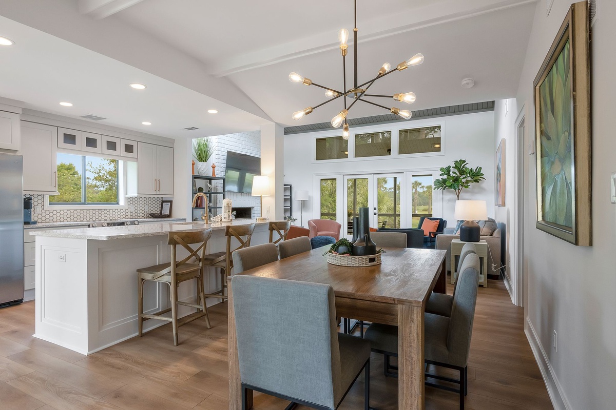 Just beyond, vaulted ceilings rise above the great room, with its modern sleeper sofa set before a soaring white brick decorative fireplace and flat-screen TV. French doors below elevated windows guide you to a screened-in patio overlooking the tranquility of the water beyond, with al fresco dining and outdoor TV.