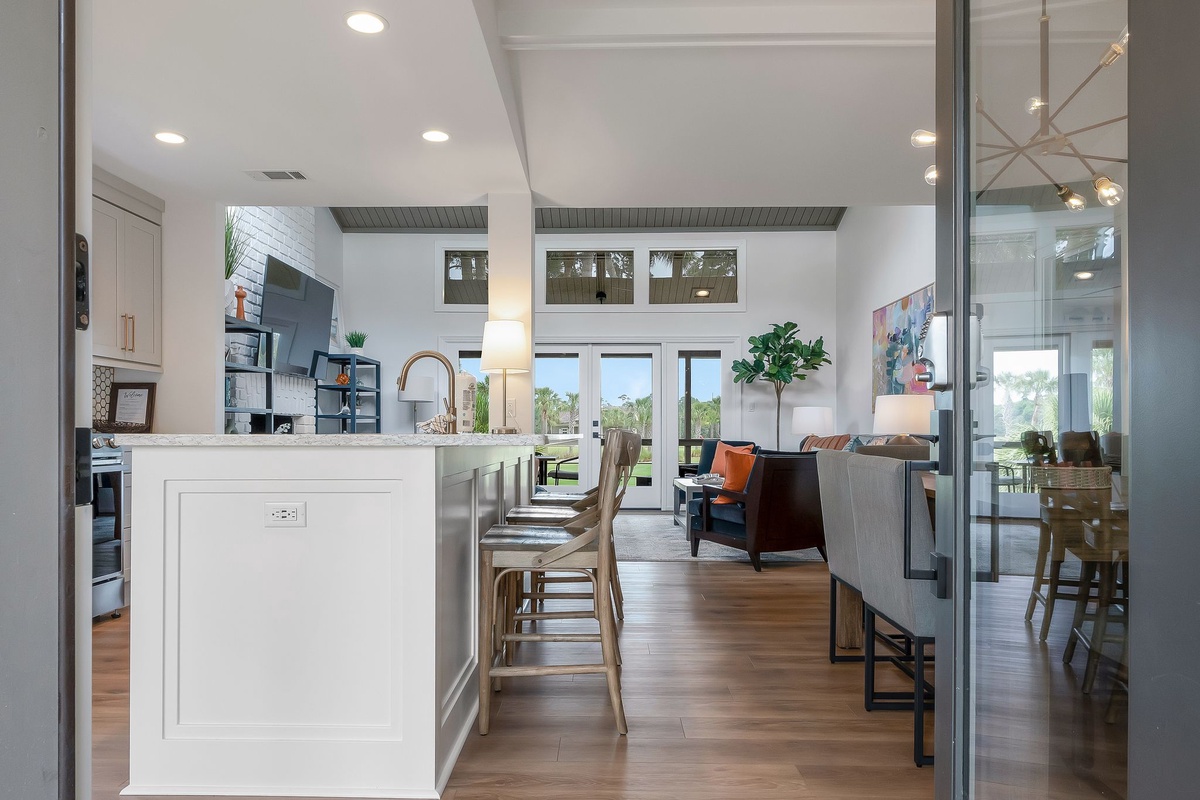 Entering through glass doors from a private courtyard, you find your eyes drawn to golf and lagoon views at the far end. Before you get there, you pass a wide oaken table offering formal dining for six as well as a wide granite counter with bar seating for three. Beyond this counter, a kitchen updated with custom cabinets and top-of-the-line appliances serves as a galley-style heart of the property.