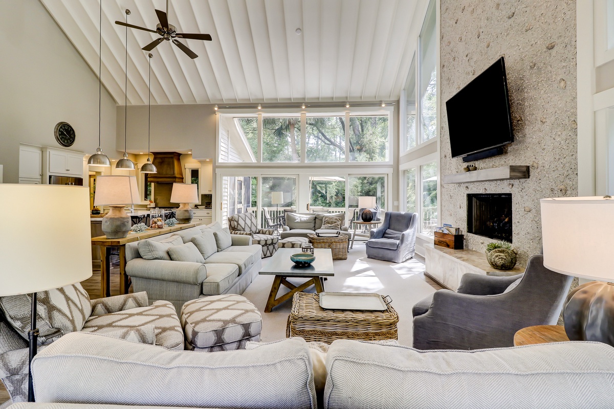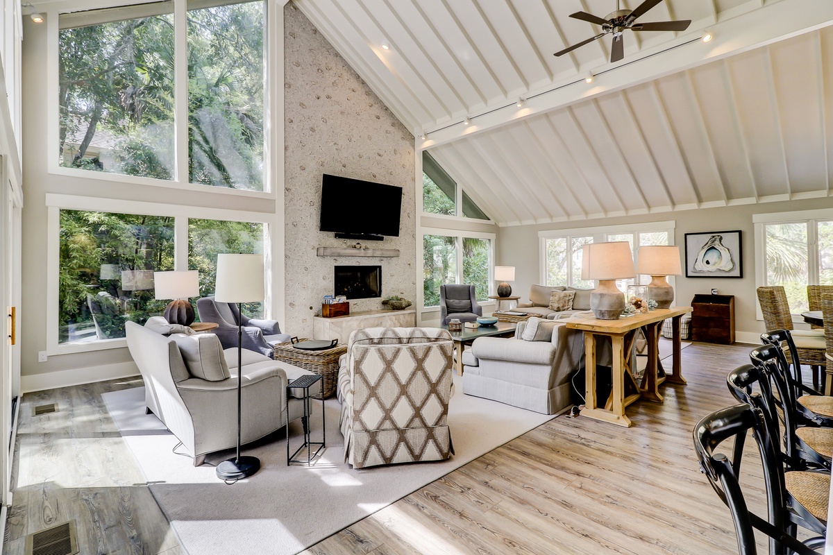 Begin with the main living space, whose vaulted ceilings of exposed beam soar above a panorama of windows filling the room with lush natural light and tranquility. A superb accent wall of tabby guides the eye down past a massive wall-mounted flat screen and decorative fireplace to a spacious living space boasting dual loveseats and four armchairs surrounding a cozy conversation area.