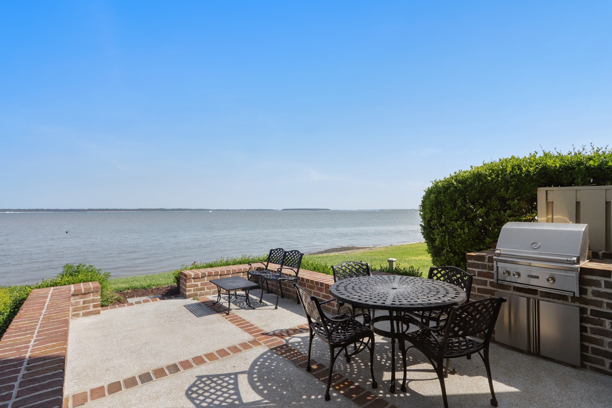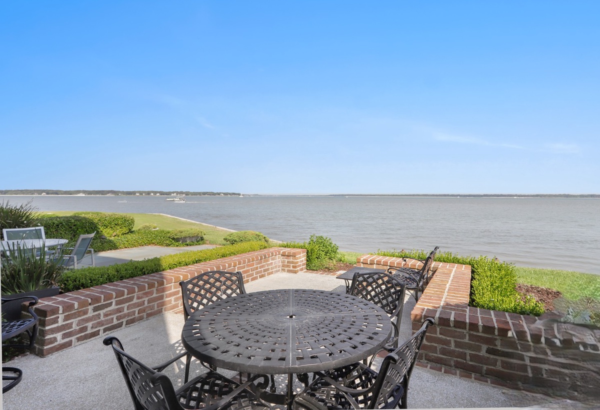 As you venture closer to the water, you pass dining for four wreathed in coastal chic décor and a living room boasting sofa, loveseat and custom built-ins surrounding a flat-screen TV. But step through sliders, and you’re treated to a panoramic view of Calibogue Sound across a brick-and-tabby patio with al fresco dining for four.
