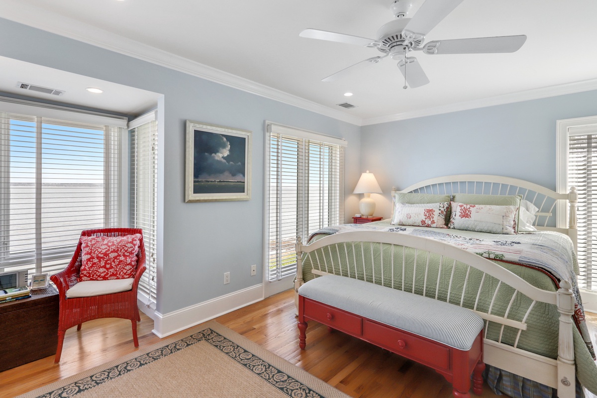 Eye-catching custom woodwork carries you upstairs to the gorgeously appointed guest rooms. One story up, you’ll find a pair of exquisite suites. In one, a king-size bed faces a flat-screen and custom built-ins in a luxurious space with private balcony, ceiling fan, and private bath with tub and shower. The second sees a king-sized bed set amid spaciousness with windows on two walls gazing out on the sound, ceiling fan, end en suite bath with a walk-in steam shower.