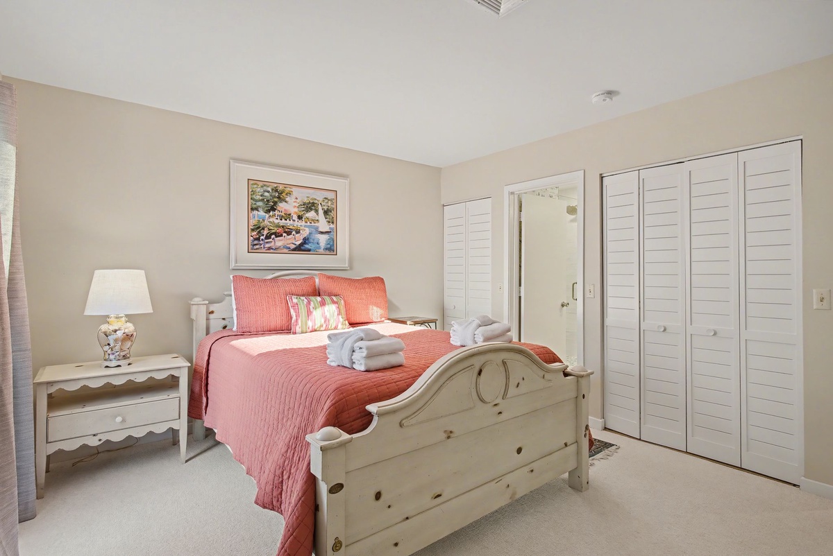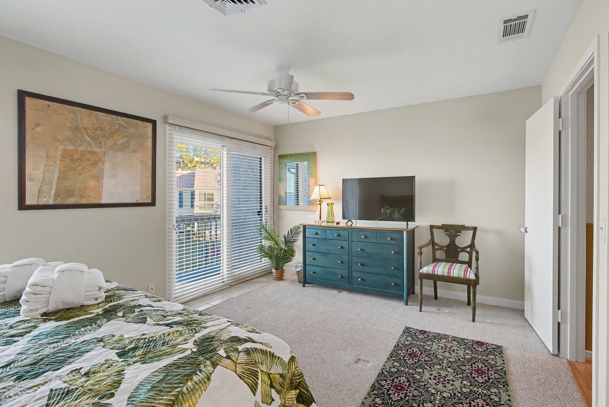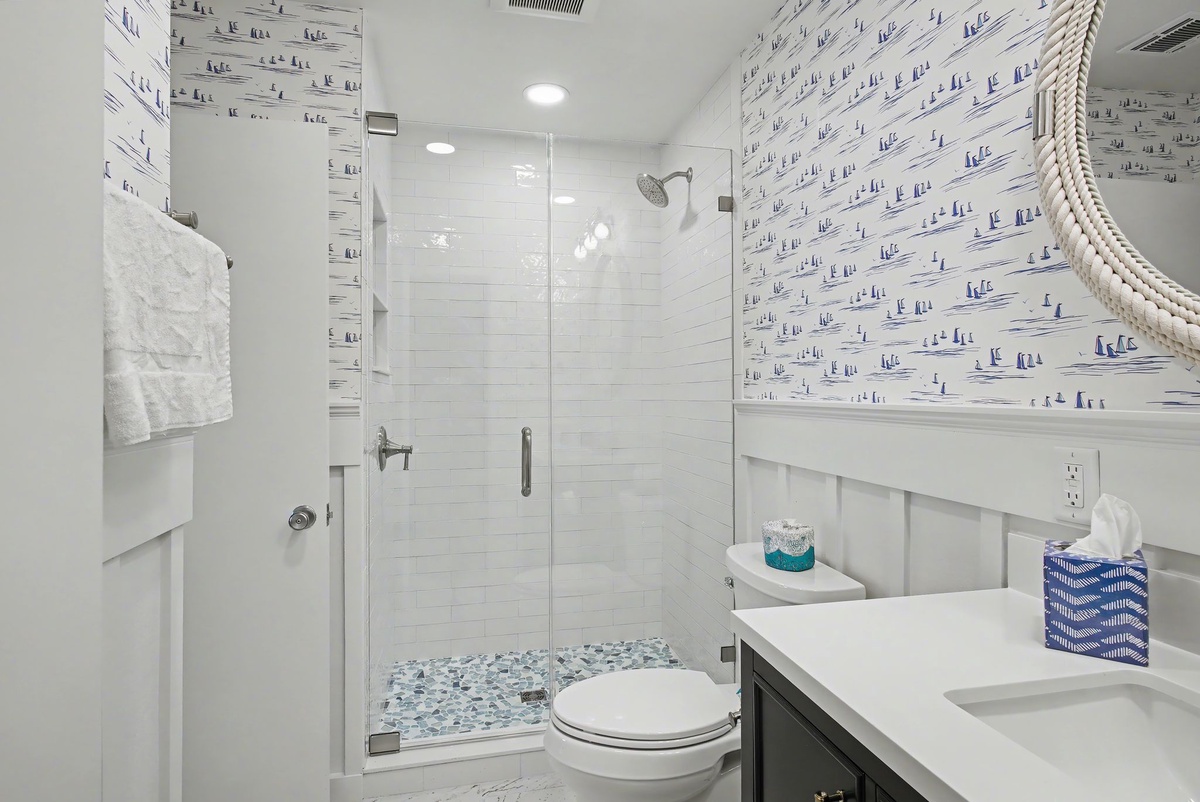 Wide sliders in the great room bridge indoor and outdoor living, passing through to peaceful patio on the edge of lush landscaping leading out to the water. The generous footprint of the guest suites allow for the whole family to rest in comfort. In one suite, shared by a queen and a twin bed with ceiling fan and flat-screen TV, a private bath offers a walk-in shower draped in nautical refinery. In the other, serving as a primary, a king-size bed anchors an indulgent space with a private balcony overlooking the water, ceiling fan, flat-screen TV and expansive ensuite bath with walk-in shower.