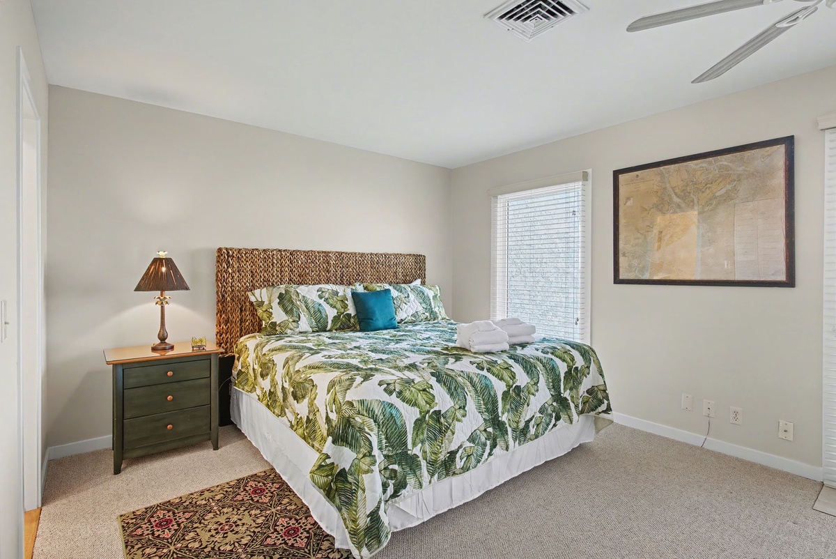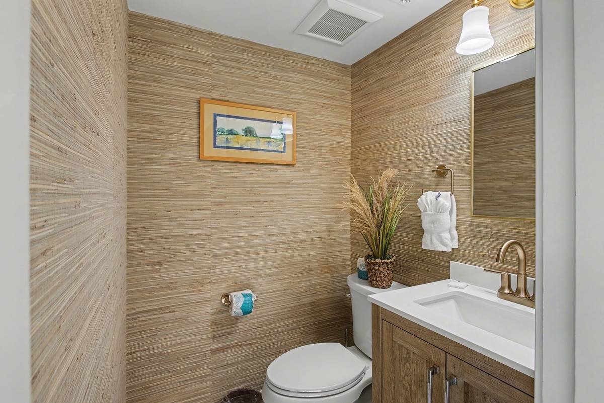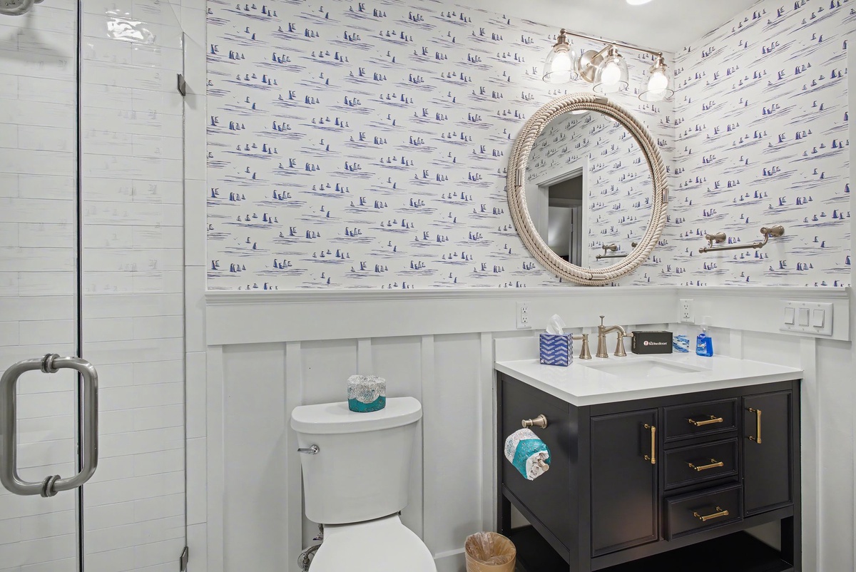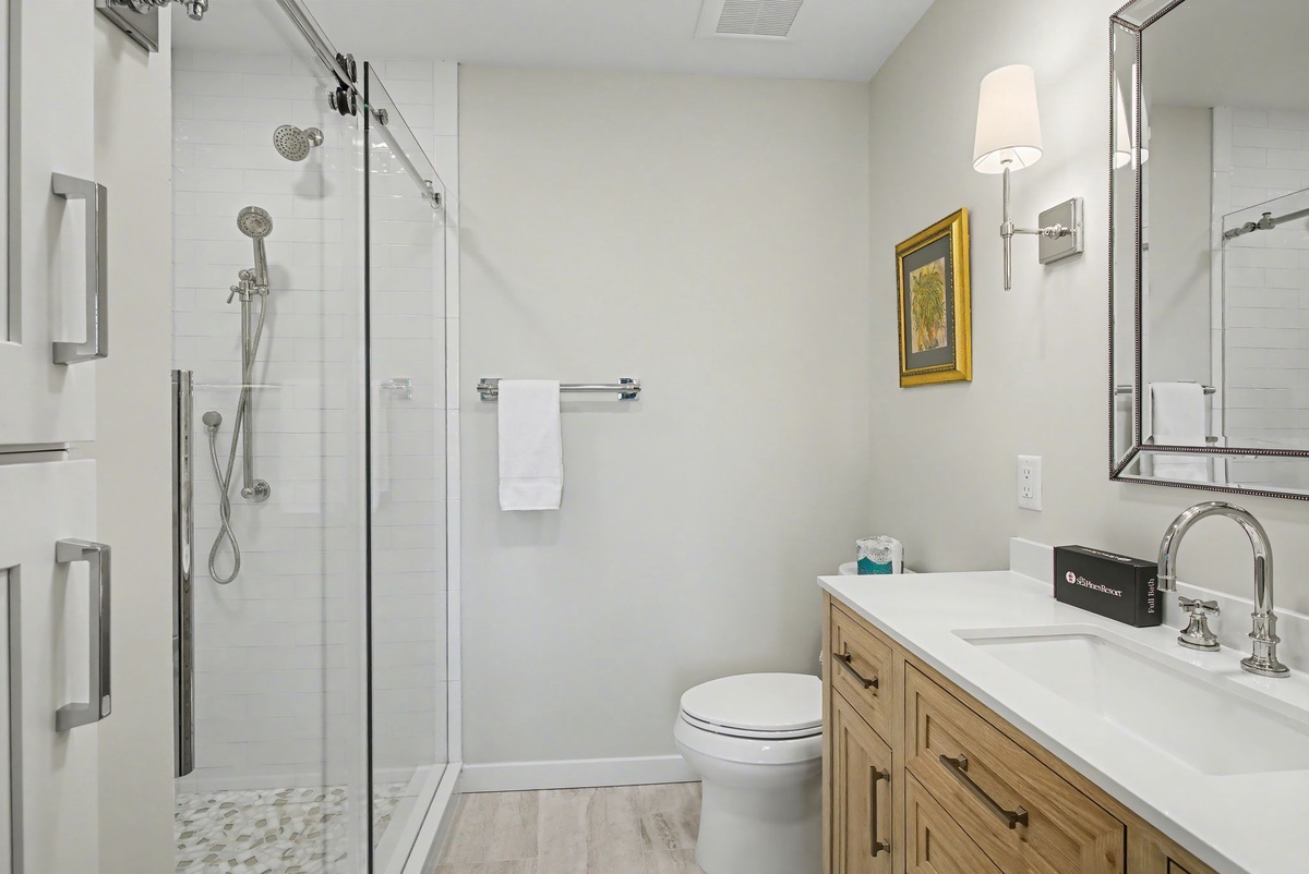 Wide sliders in the great room bridge indoor and outdoor living, passing through to peaceful patio on the edge of lush landscaping leading out to the water. The generous footprint of the guest suites allow for the whole family to rest in comfort. In one suite, shared by a queen and a twin bed with ceiling fan and flat-screen TV, a private bath offers a walk-in shower draped in nautical refinery. In the other, serving as a primary, a king-size bed anchors an indulgent space with a private balcony overlooking the water, ceiling fan, flat-screen TV and expansive ensuite bath with walk-in shower.