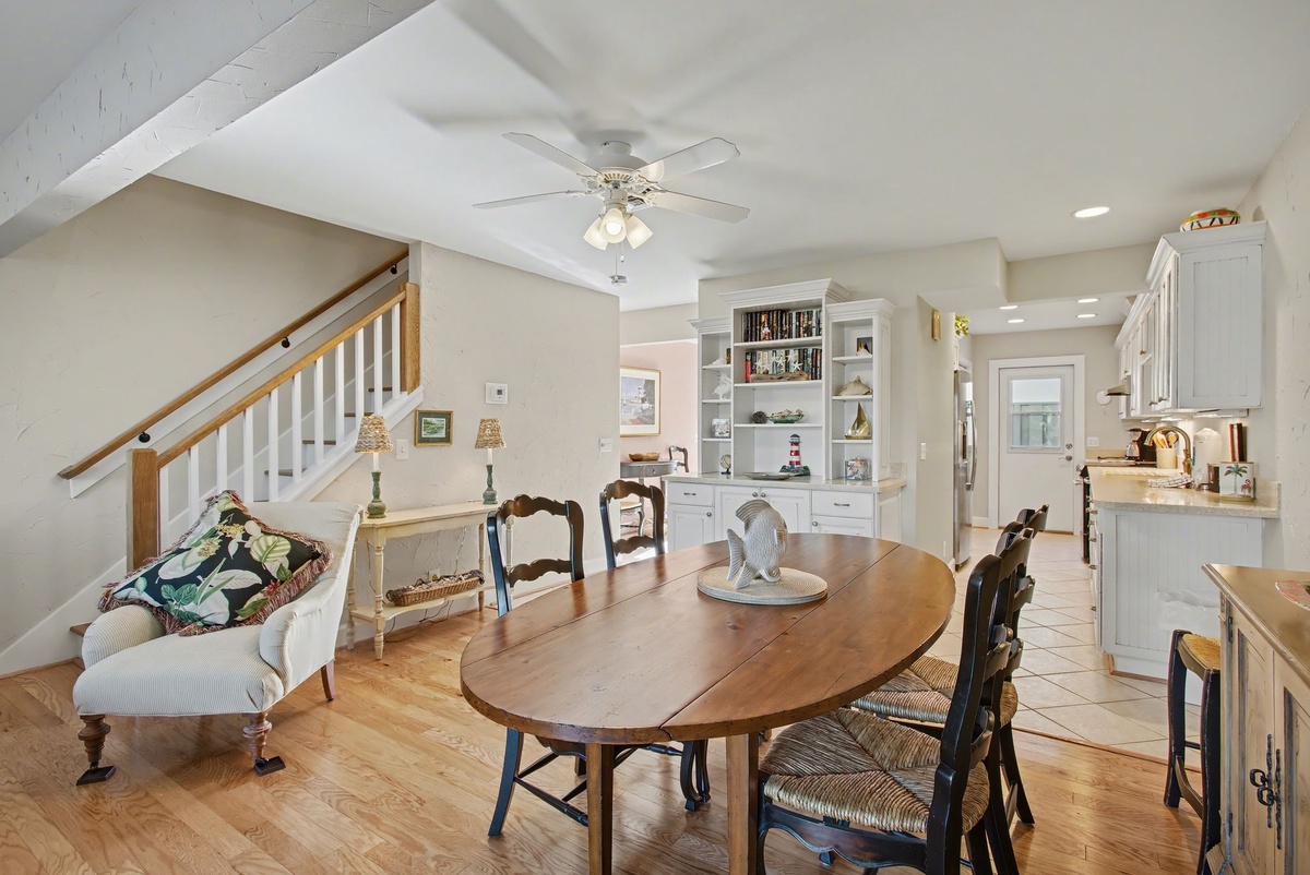 The open floor plan of the villa’s great room draws these views in, painting lush natural light across a living room with sofa, loveseat and flat-screen TV, into the galley kitchen past formal dining for six. Beautifully updated with craftsman style and modern amenities, the kitchen stretches granite counters around stainless steel appliances including flat-cooktop stove.