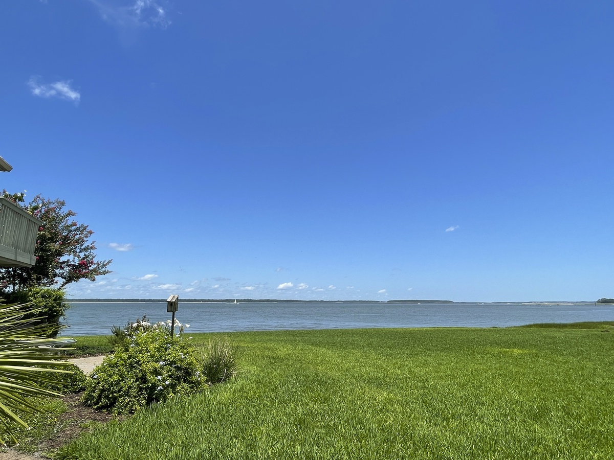 Dark hardwood floors greet you in the foyer and continue throughout the entire villa. With a sparkling water view, the living room features a nutmeg leather nail-head sofa, armoire with a flat screen TV and DVD. Sliding glass doors open to the pebbled patio with outdoor dining table for six, a grassy area, and then the spectacular vista of Calibogue Sound, with Daufuskie Island in the distance.