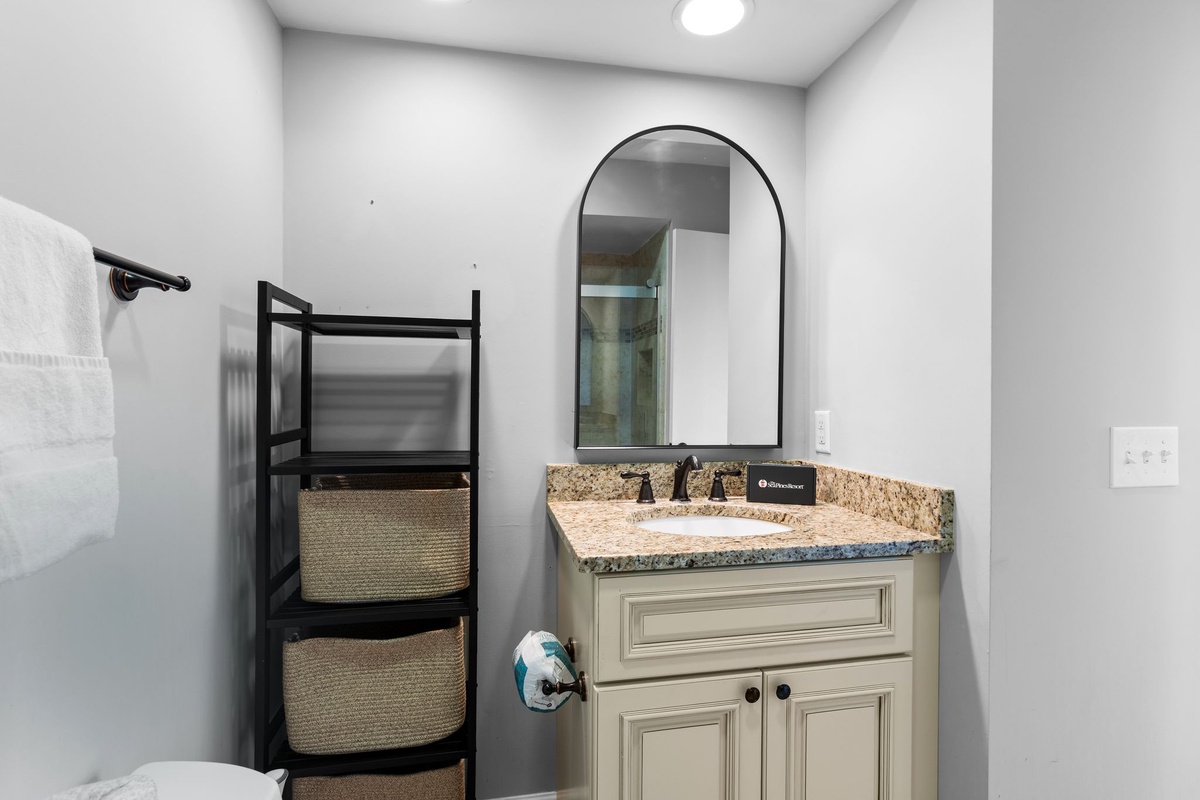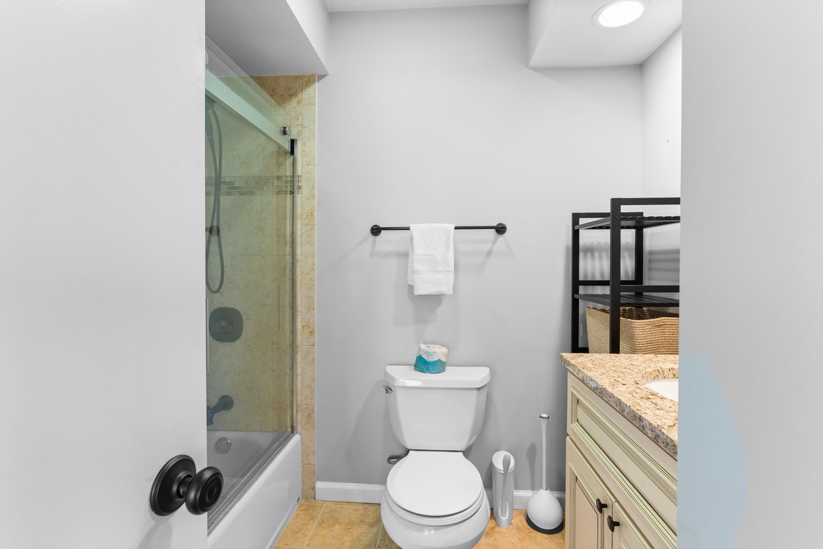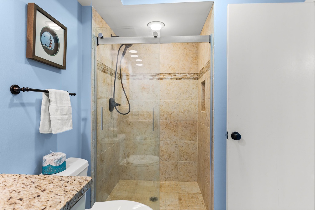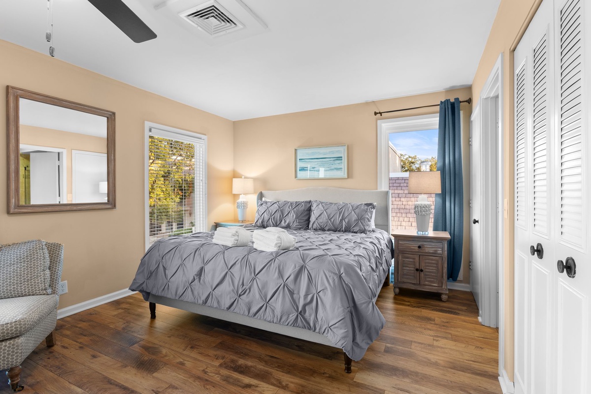 Atop the two-tone stairs, a pair of suites flank a wide hallway with concealed washer and dryer for all the convenience of home. The king suite at one end enjoys lush spaciousness along with ceiling fan, flat-screen TV and ensuite bath with walk-in shower. The king and queen suite opposite benefits from a private balcony gazing out on the sound, with a ceiling fan, flat-screen TV and ensuite bath with tub and shower rounding out the luxurious amenities.
