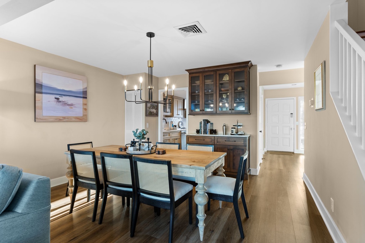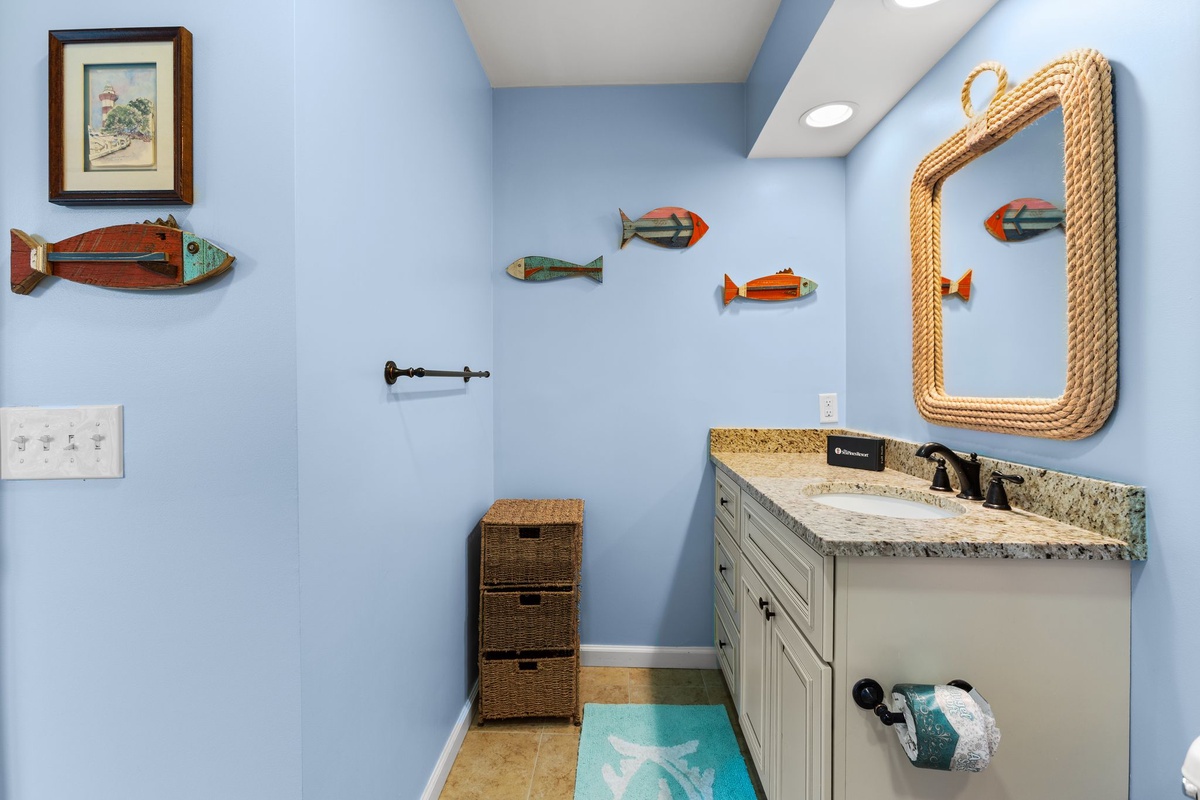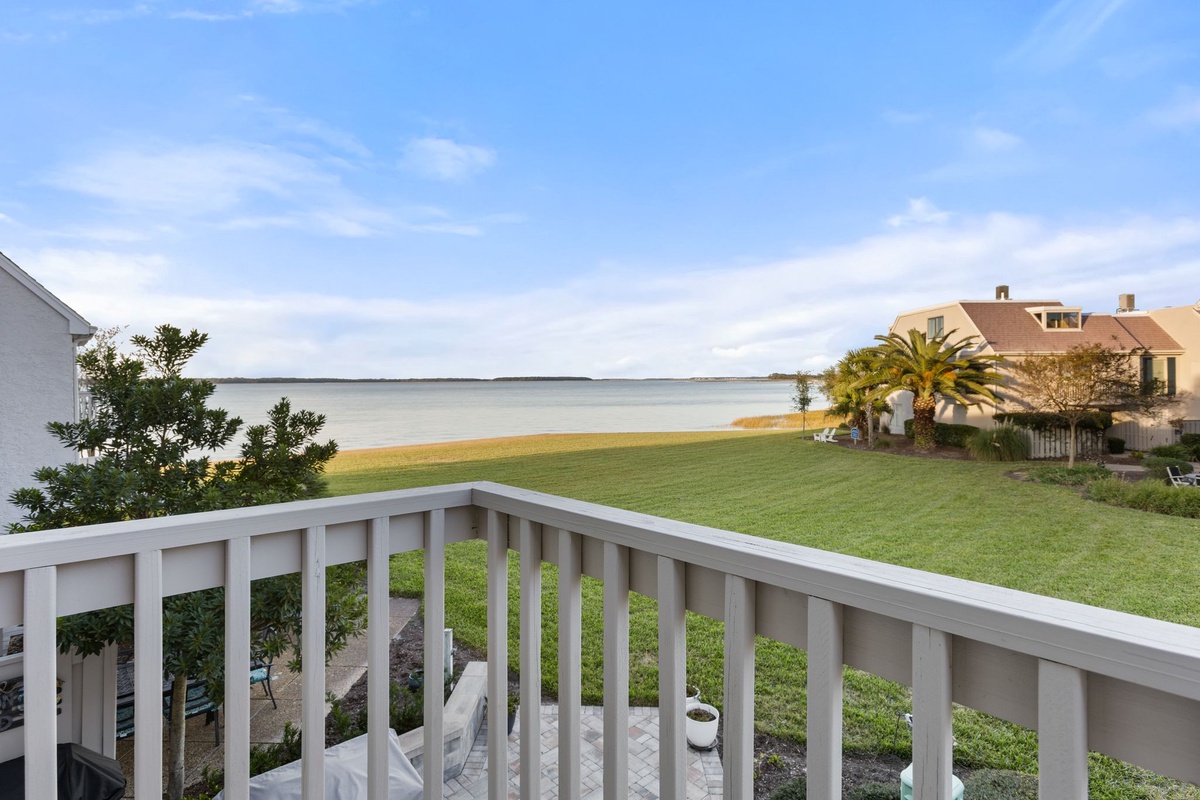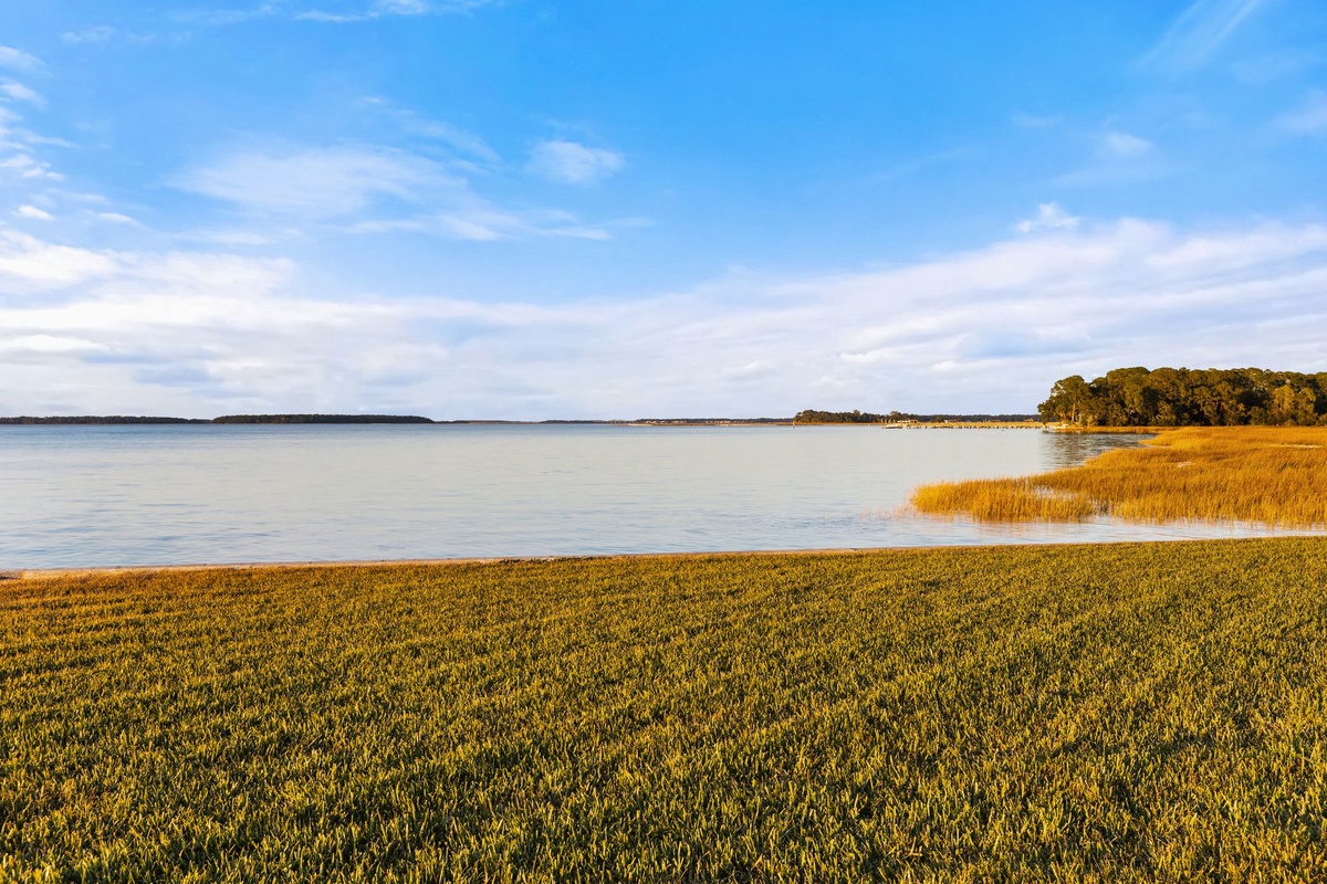 Wide plank flooring guides you from the entry courtyard and into the beautifully updated living spaces, centered on views out to the water. Dining for six beneath a chandelier transitions to a superbly comfortable living room, with sectional sofa and dual armchairs facing a flat-screen TV beside a wall of sliders. Step through those sliders, and you’re soaking in sparkling Calibogue Sound scenery from a shaded patio with outdoor seating for four.