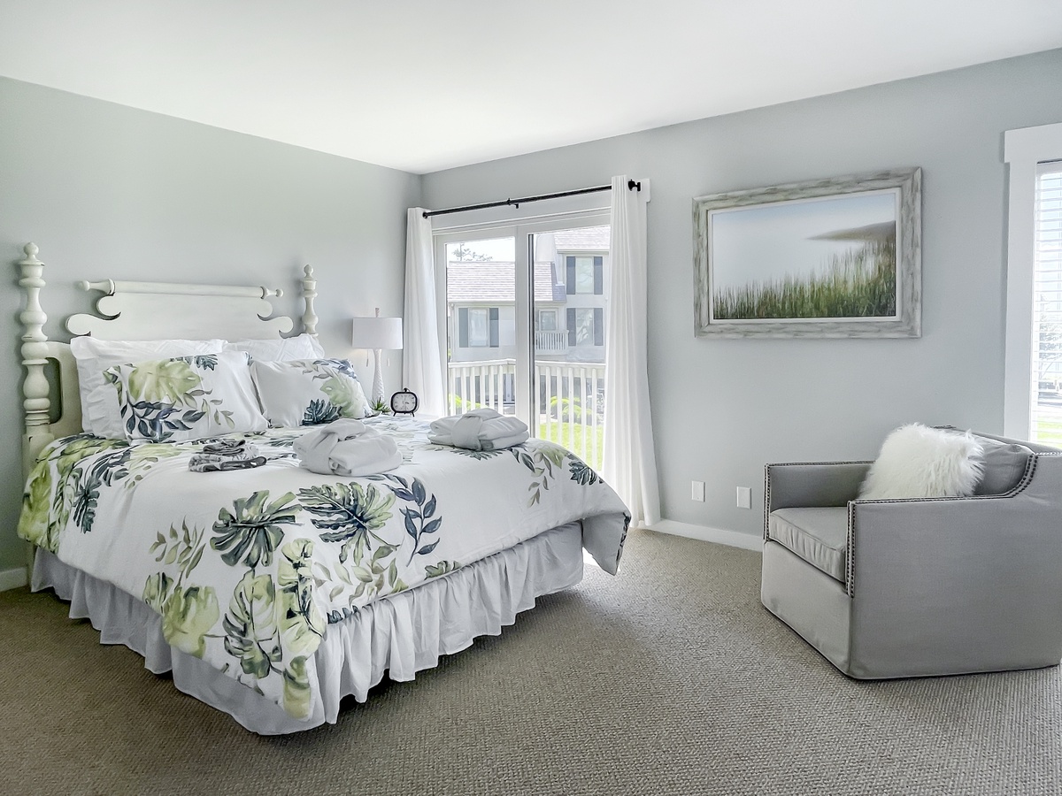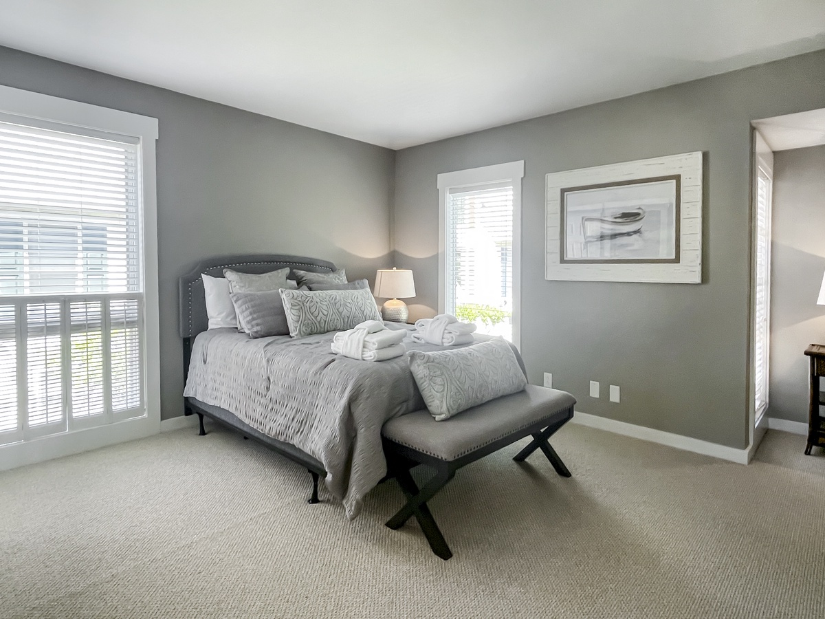 Set on the second floor, the two guest rooms exude updated coastal sophistication and lush comfort. In one, a king bed anchors a spacious guest room with flat screen TV, windows on two walls and access to private bath with tub and shower. The other presents a full five-star experience with queen bed, private balcony to soak in the breezes off the Sound, flat-screen TV and en suite bath with walk-in shower.