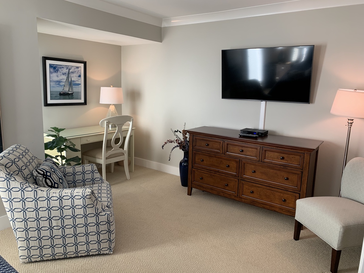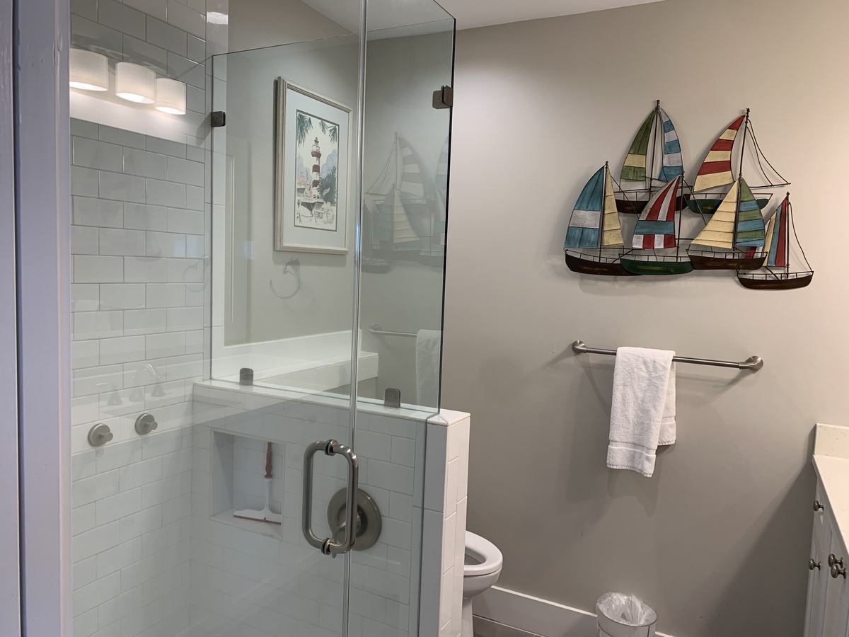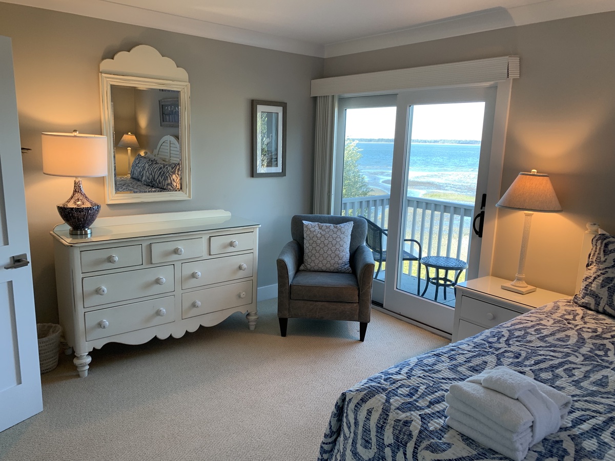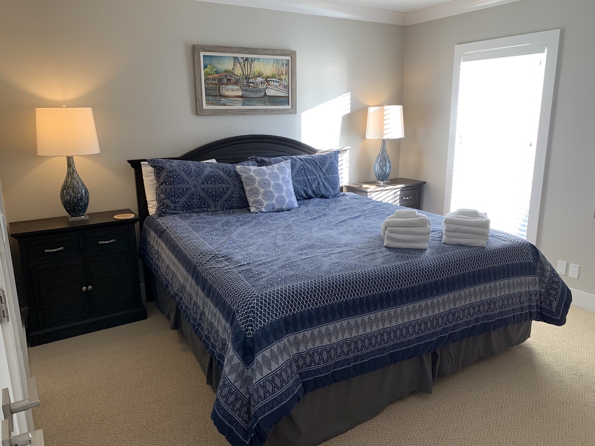 The elegance and comfort continue in the two full suites, each blissfully appointed for tranquility and breezy peace. In one, a king-size bed is flanked by sliders that take you out to a private balcony, with a full private bath boasting a cavernous walk-in shower. In the other, a plush swing king enjoys tall windows, soothing ambience and a full en suite bath with tub and shower.