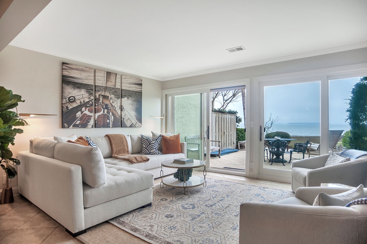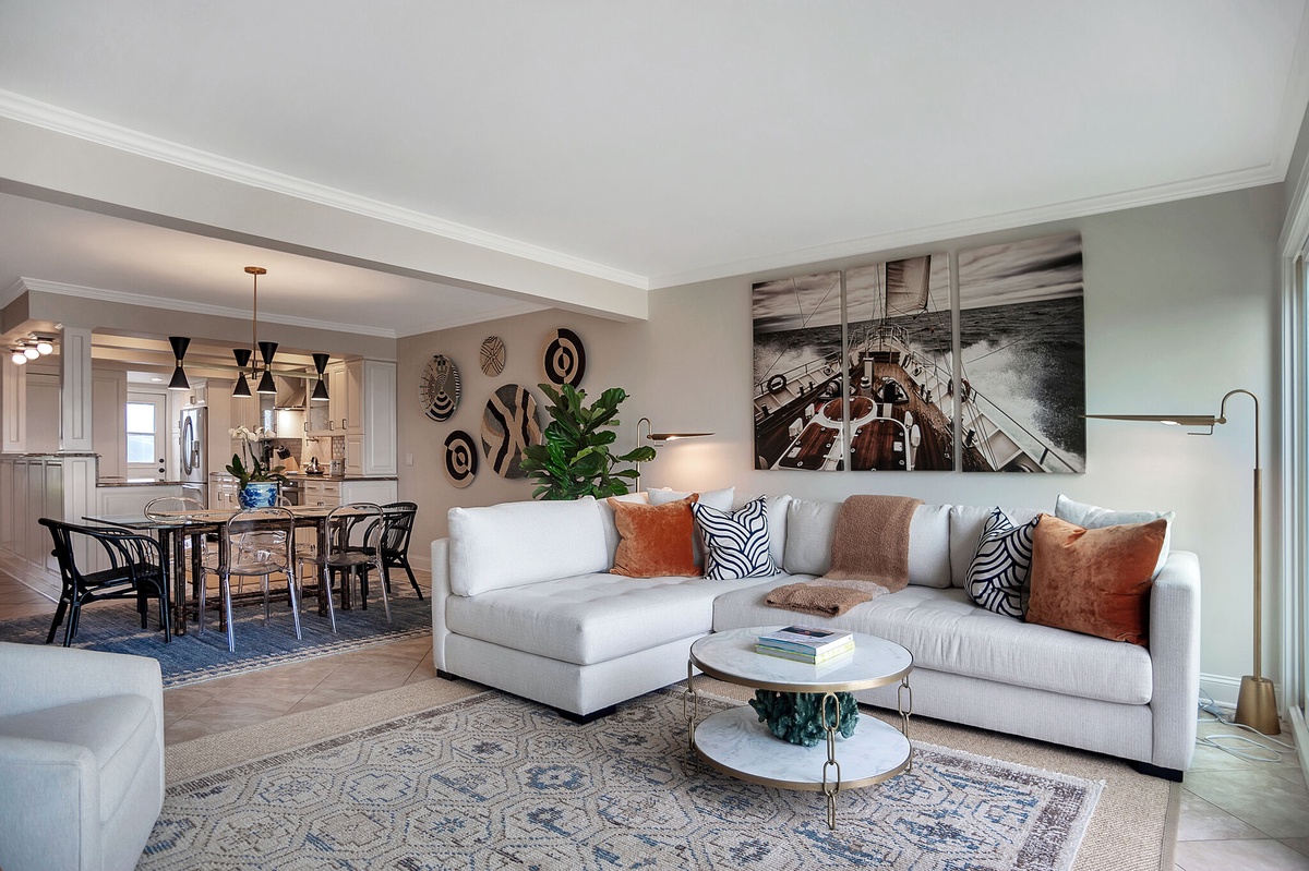 The open living space frames dazzling water views with an inspired modern design. In the living room, this style is expressed through oversized art above a plush sectional sofa facing a wide wall-mounted flat-screen TV and dual armchairs. In the dining room, through a glass-topped table set for six beneath a boldly contemporary chandelier and woven artwork. In the kitchen, custom millwork and granite counters encircle a full suite of state-of-the-art stainless steel appliances.