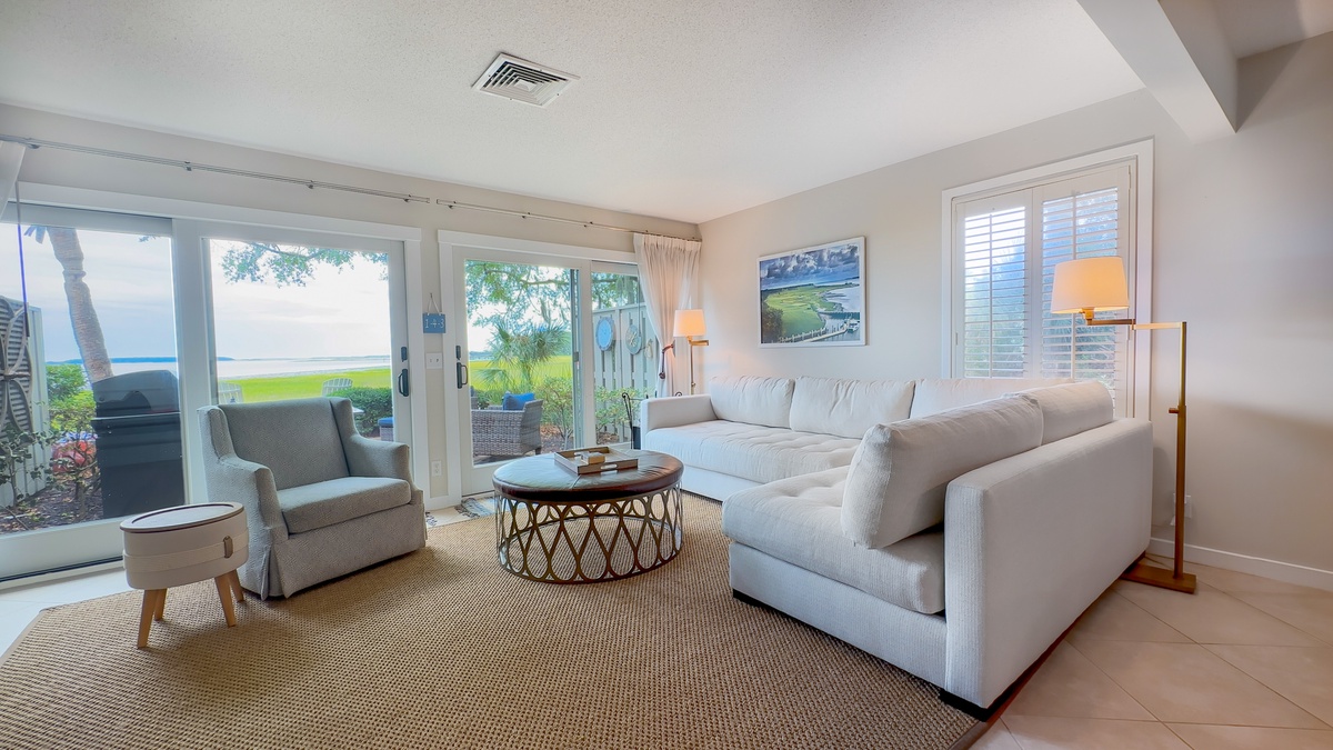 At the heart of the villa, the open living spaces exult in views out to the water. Soak in the scenery from the relaxing plush comfort of the extra wide chaise sofa, set before a flat-screen TV and decorative fireplace, or step through sliders to a paradise of outdoor living. Here, pavers guide your eye past the fire table, beyond the extensive seating, toward jaw dropping views of Calibogue Sound, where herons and egrets take wing.