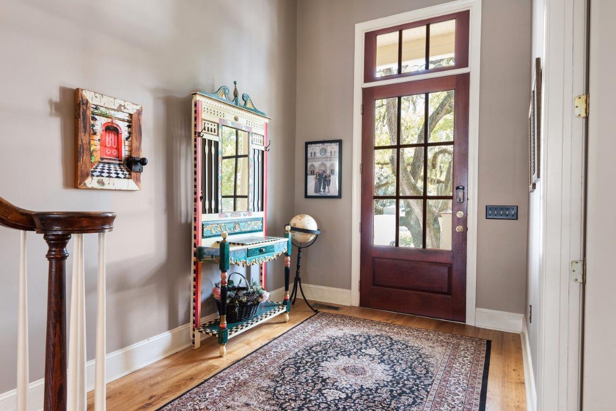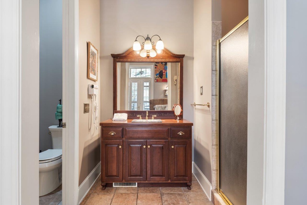 The tour of the South continues with a pair of upstairs guest rooms, the Charleston Suite and the Savannah suite. Each boasts a king-size bed set between dazzling pillars, as well as private baths with jacuzzi tubs and walk-in showers, and shared access to the stunning second-story porch.