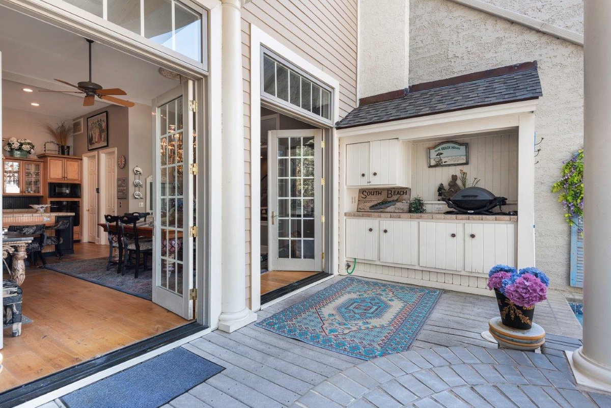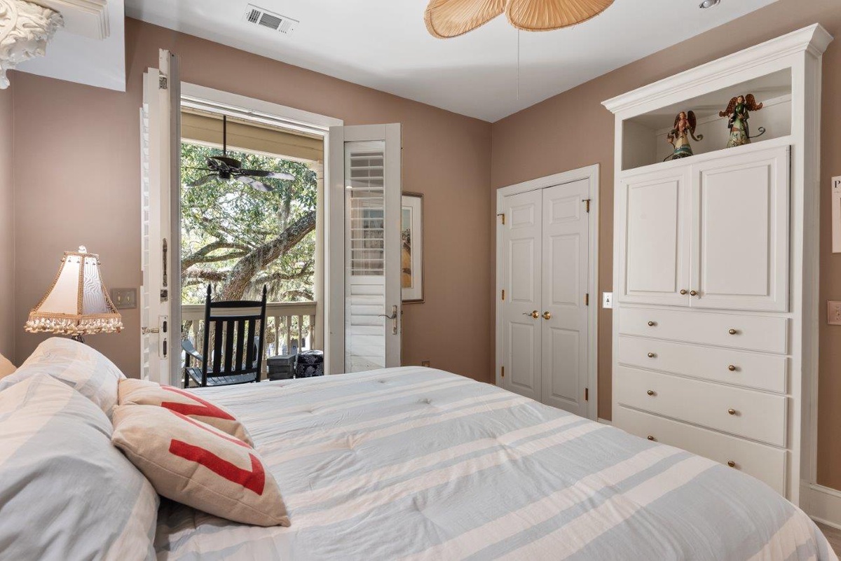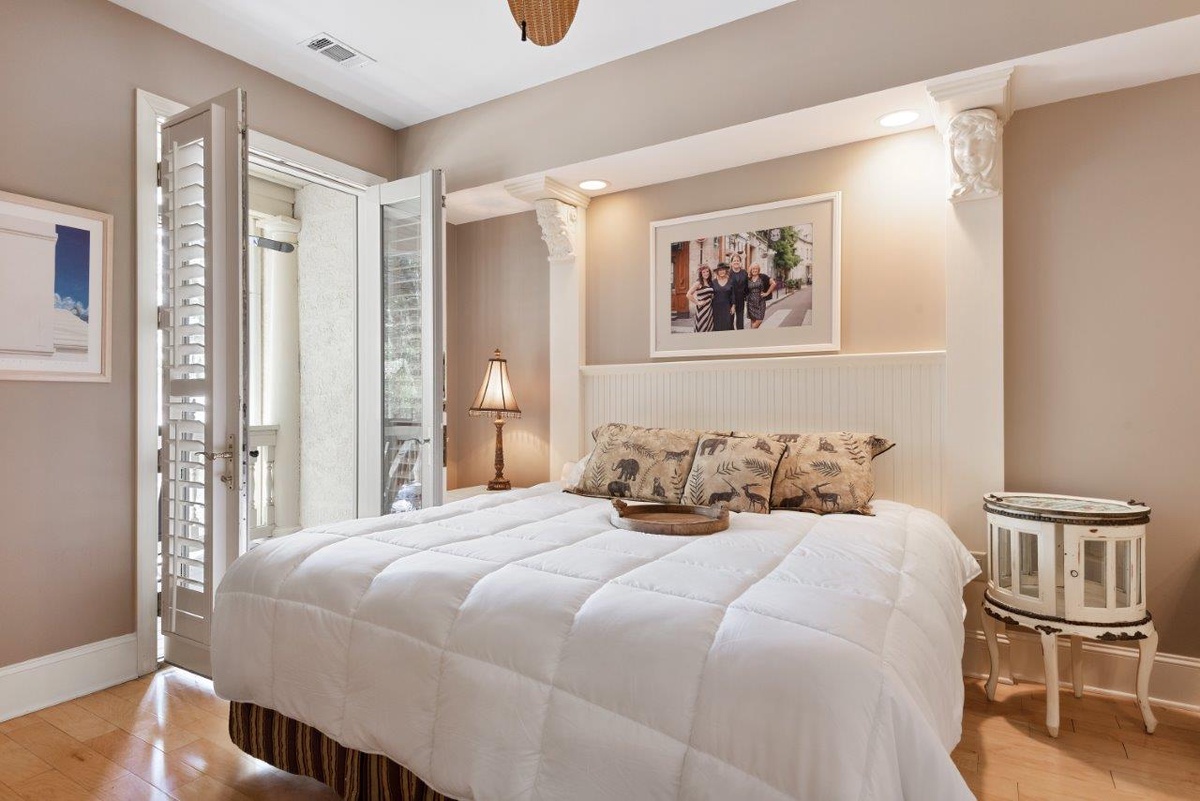 The coup de grace of this enchanting home is the Bermuda Suite, a suitably luxurious space that serves as an owner’s suite. Not only does it offer a plush king-size bed set between columns, flat-screen TV set in built-in armoire, and en suite bath with expansive walk-in shower, it provides everything needed for a hideaway all to oneself. Here you can brew your morning coffee at the spacious kitchenette, then enjoy it in elevated solitude in the soaring private porch.