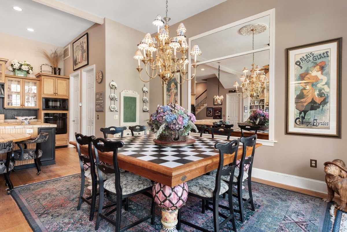 To one end of this space, a plush sectional sofa fronts a wide flat-screen TV ringed by custom built-ins. To the other end, a wide Mackenzie-Childs dining table with room for the entire party to gather around a meal and conversation. Just enjoying a bite of breakfast before heading out? Take your coffee at the eye-catching semi-circle table, integrated into the wide tiled counters of the kitchen’s center island. Infused with timeless Southern elegance, this expansive kitchen boasts wide farmhouse sink, custom cabinets and a full suite of gourmet appliances.