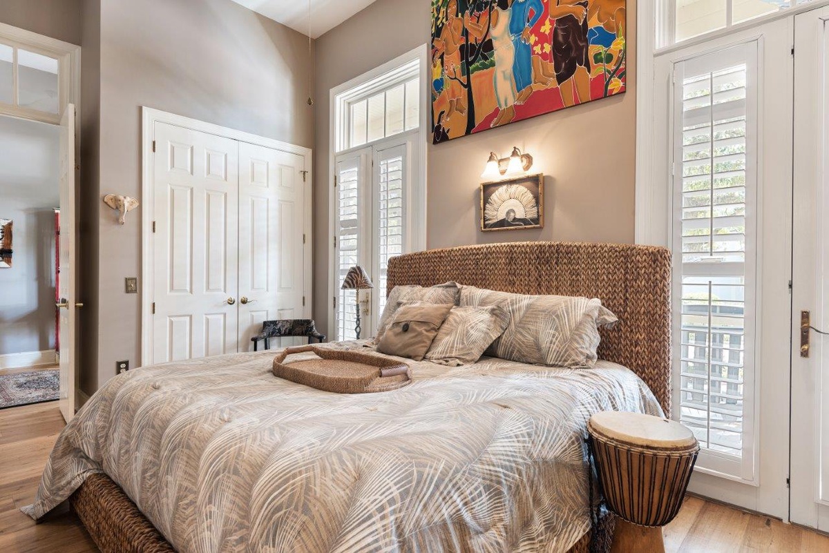 The same architectural brilliance and timeless décor that set this property apart lend comfort and elegance to the guest suites. The first, found on the main floor, has been dubbed “The Hemingway Suite,” infused with lush natural light from plantation-shuttered windows that climb toward extra tall ceilings. Set amid stylish custom built-ins, the king-size bed, ceiling fan, flat-screen TV and private bath.