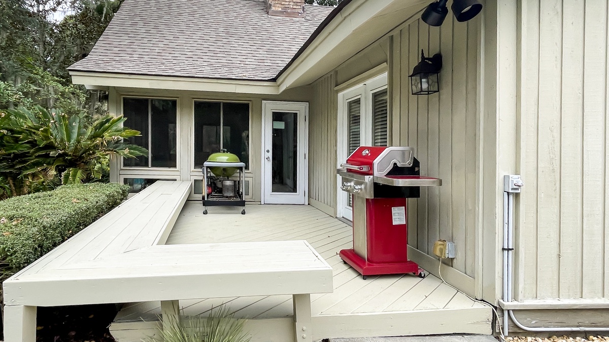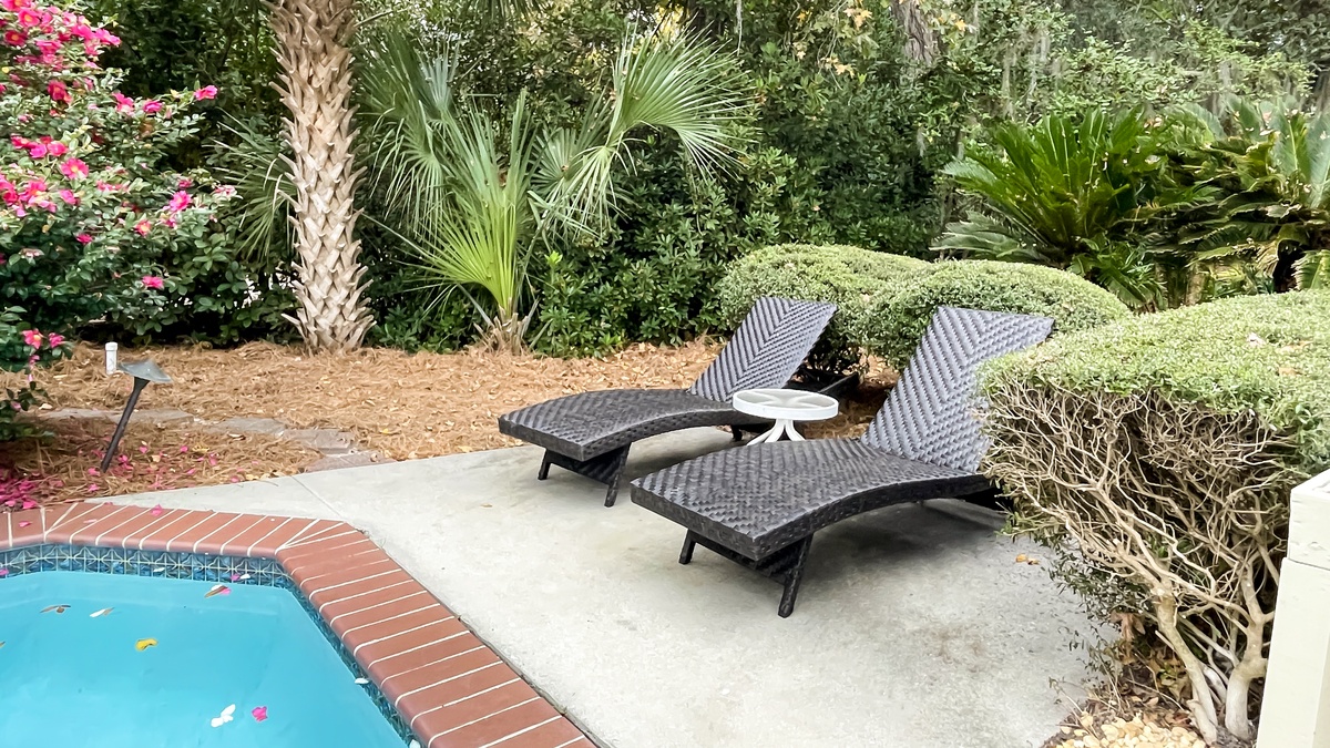 The exterior is as wonderful as the interior with a freeform swimming pool, surrounded by lush natural landscaping. The back deck also features umbrella-covered outdoor dining table for four.
