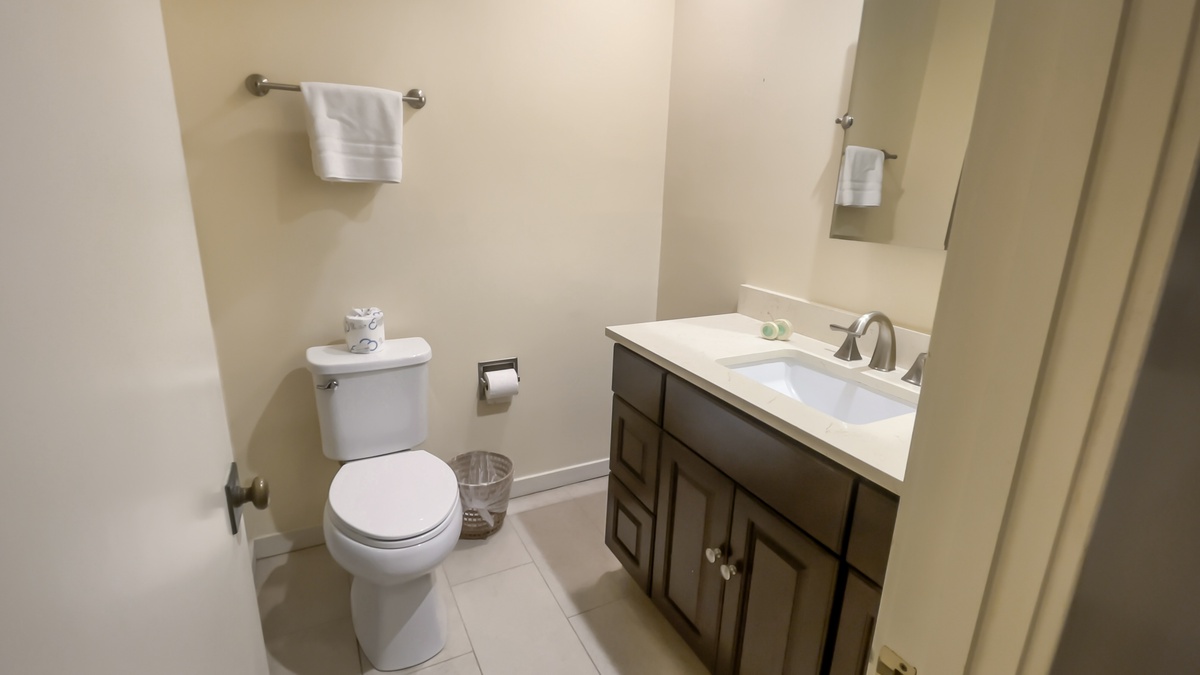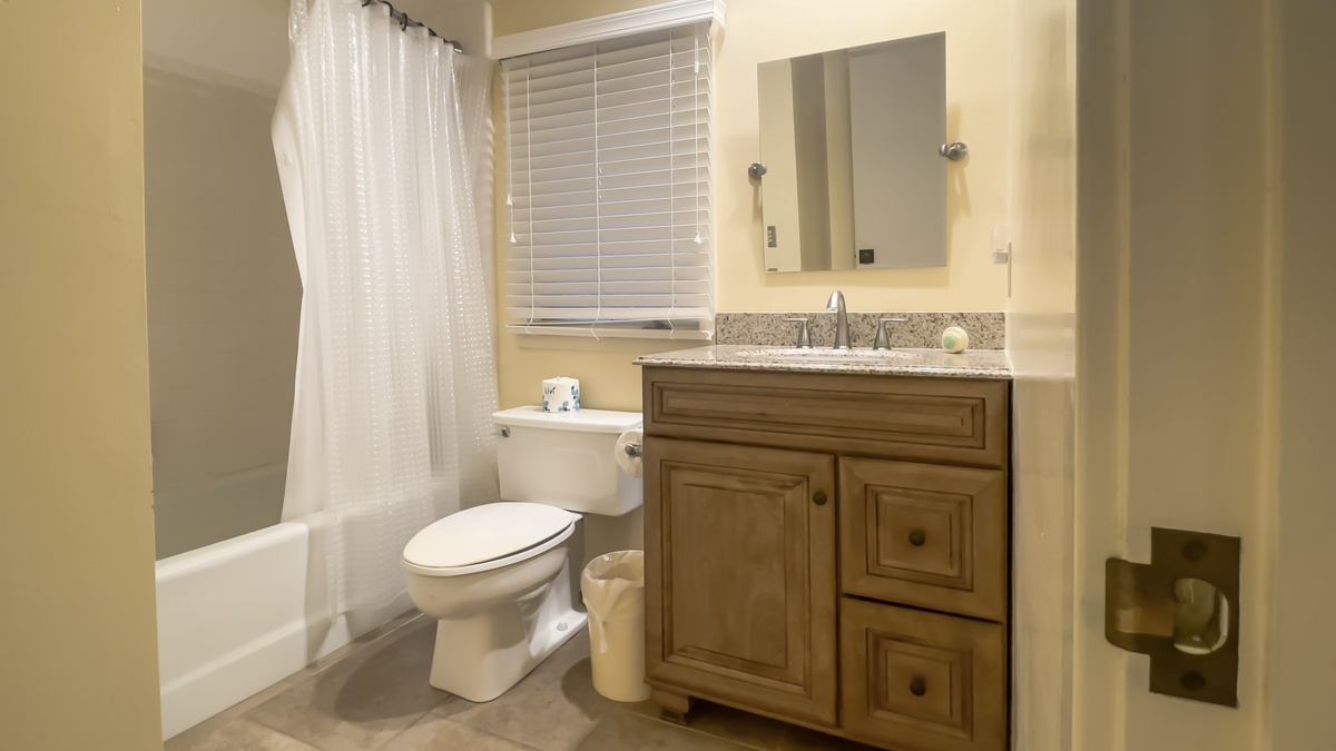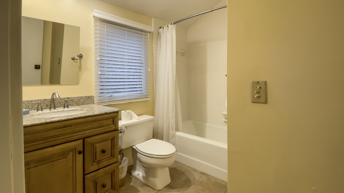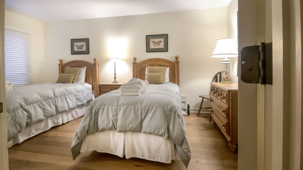 The additional two bedrooms each hold two twin beds with tropical bedspreads and a wall-mounted flat screen TV. Each of these guest rooms has a renovated private bathroom with stone vanity and tub/shower combination.