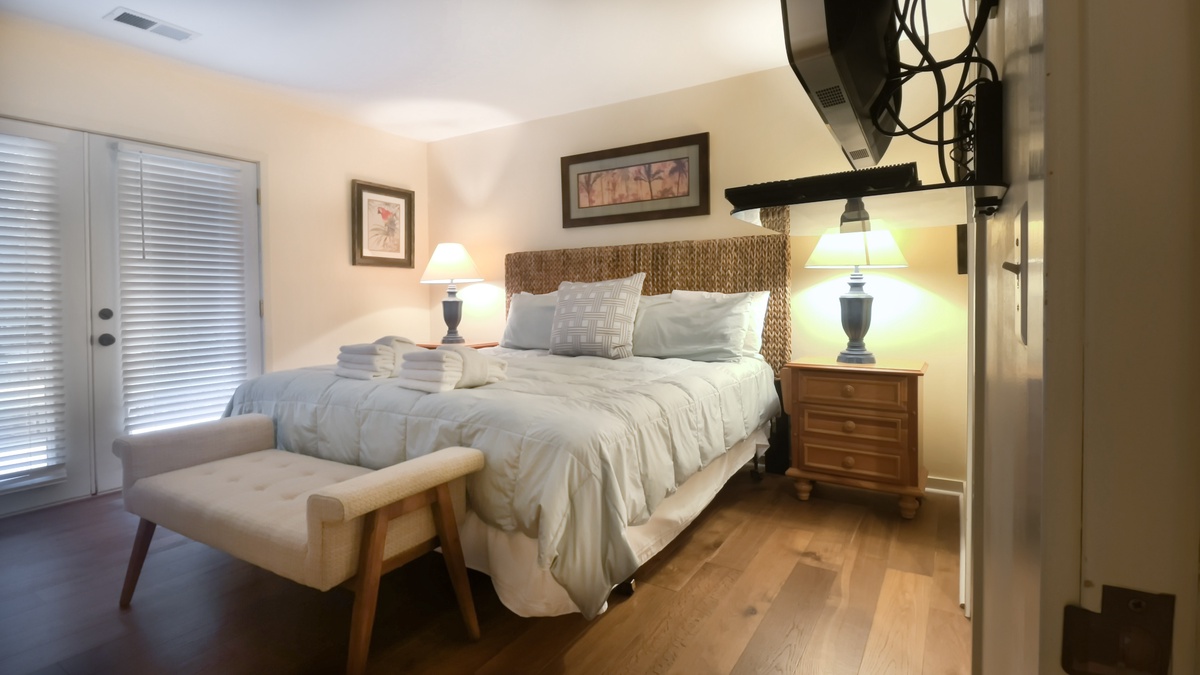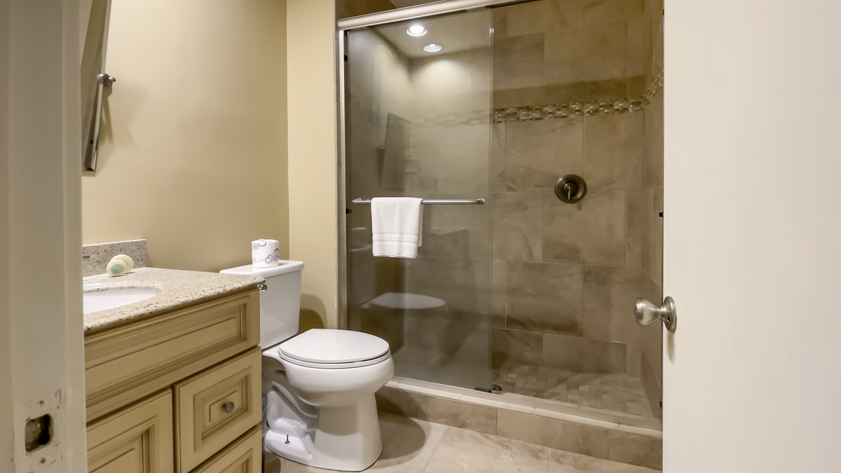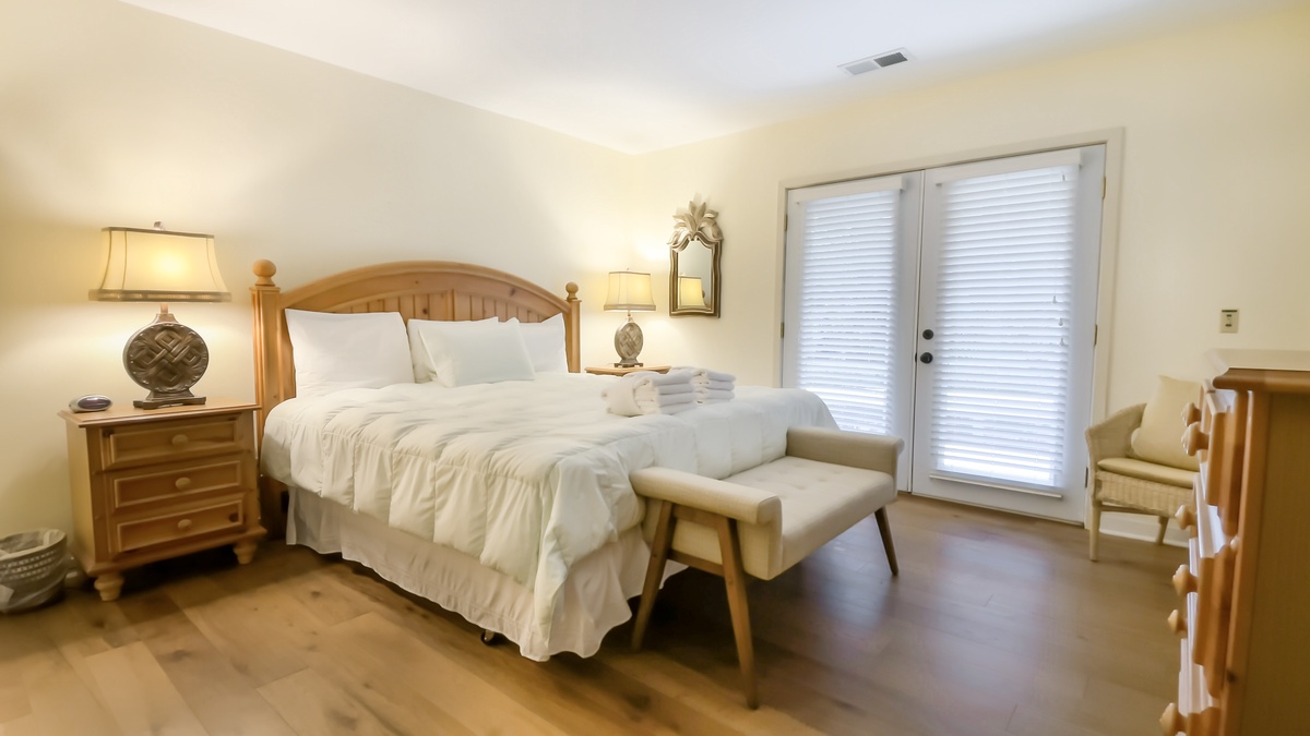 Each master bedroom offers a king-sized bed, lovely furnishings and a flat screen TV. Further, the master suites enjoy a private patio, accessed through French doors. The two master baths hold a saturnia-surround shower and a solid surface vanity.