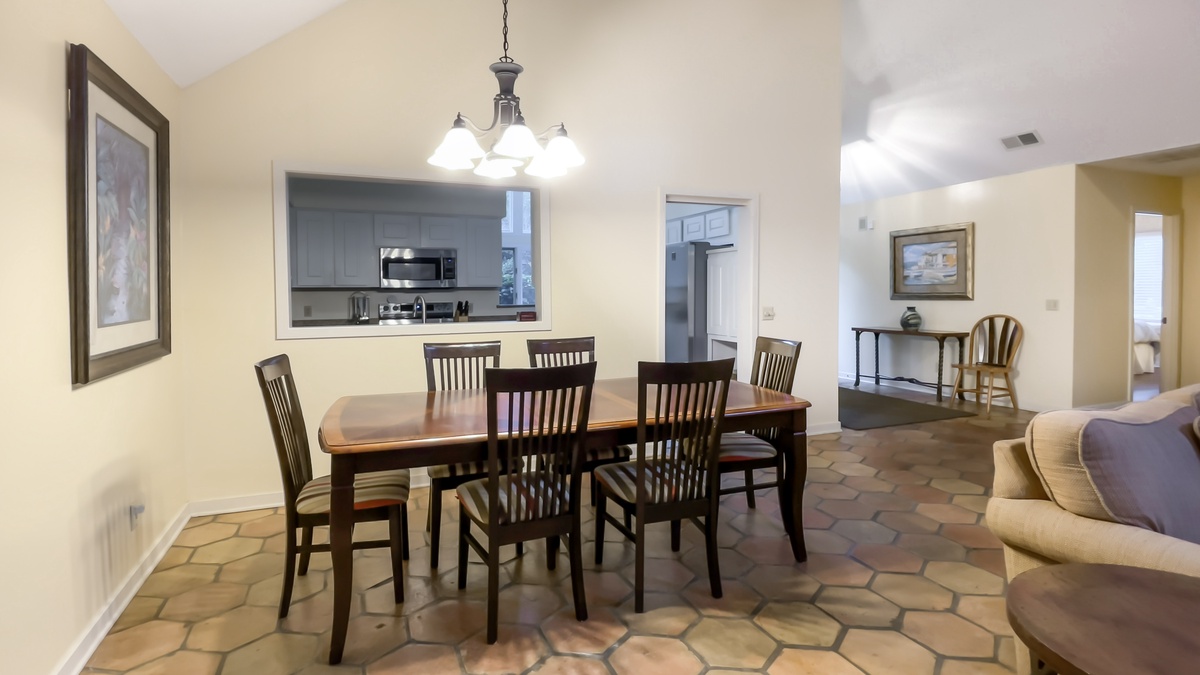 Comprised in this generously open space is the dining area with a shaker-style dark wood table featuring seating for eight, with lighting fixture above.