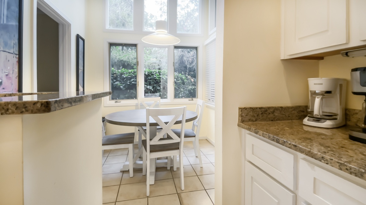 Open to the living space, the fully appointed kitchen features tan granite countertops, white paneled cabinetry and tile flooring. A separate breakfast nook with plenty of natural light features a table for four. Nearby is the laundry room complete with washer, dryer, and utility sink.