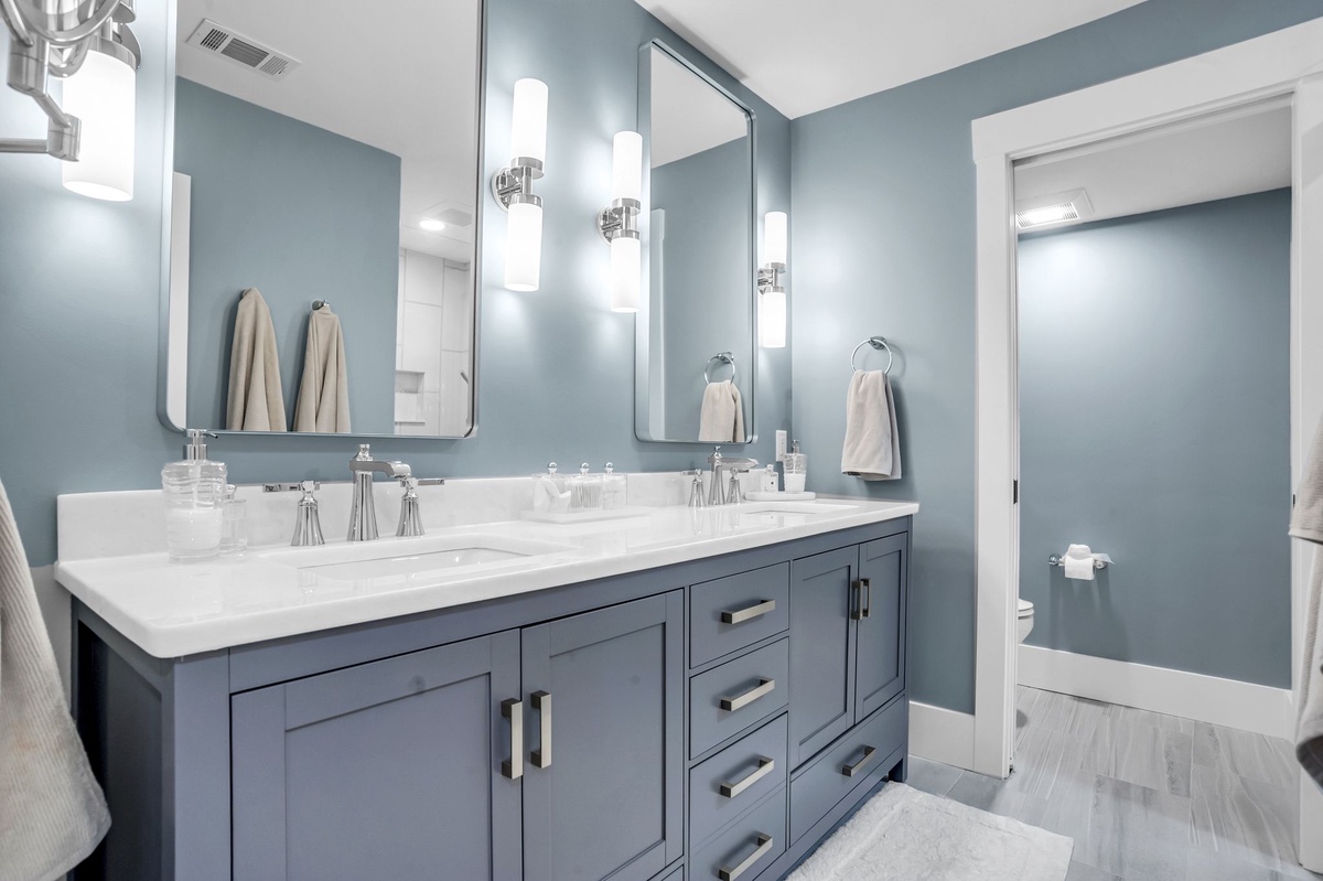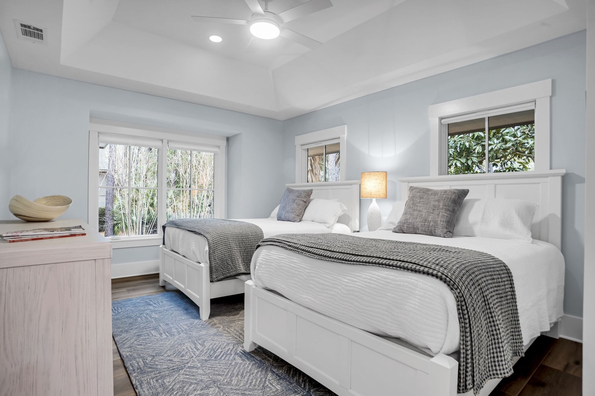 To the left of the main living space are four bedrooms, each with their own flat screen TV and ensuite bathroom with walk-in showers or bathtub/shower combination. . Three of the bedrooms are furnished with king-size beds, each with their own unique furnishings offering comfort and gorgeous design. The fourth bedroom offers 2 full-sized beds which are especially great for children, young adults or extra sleeping area for any adult.