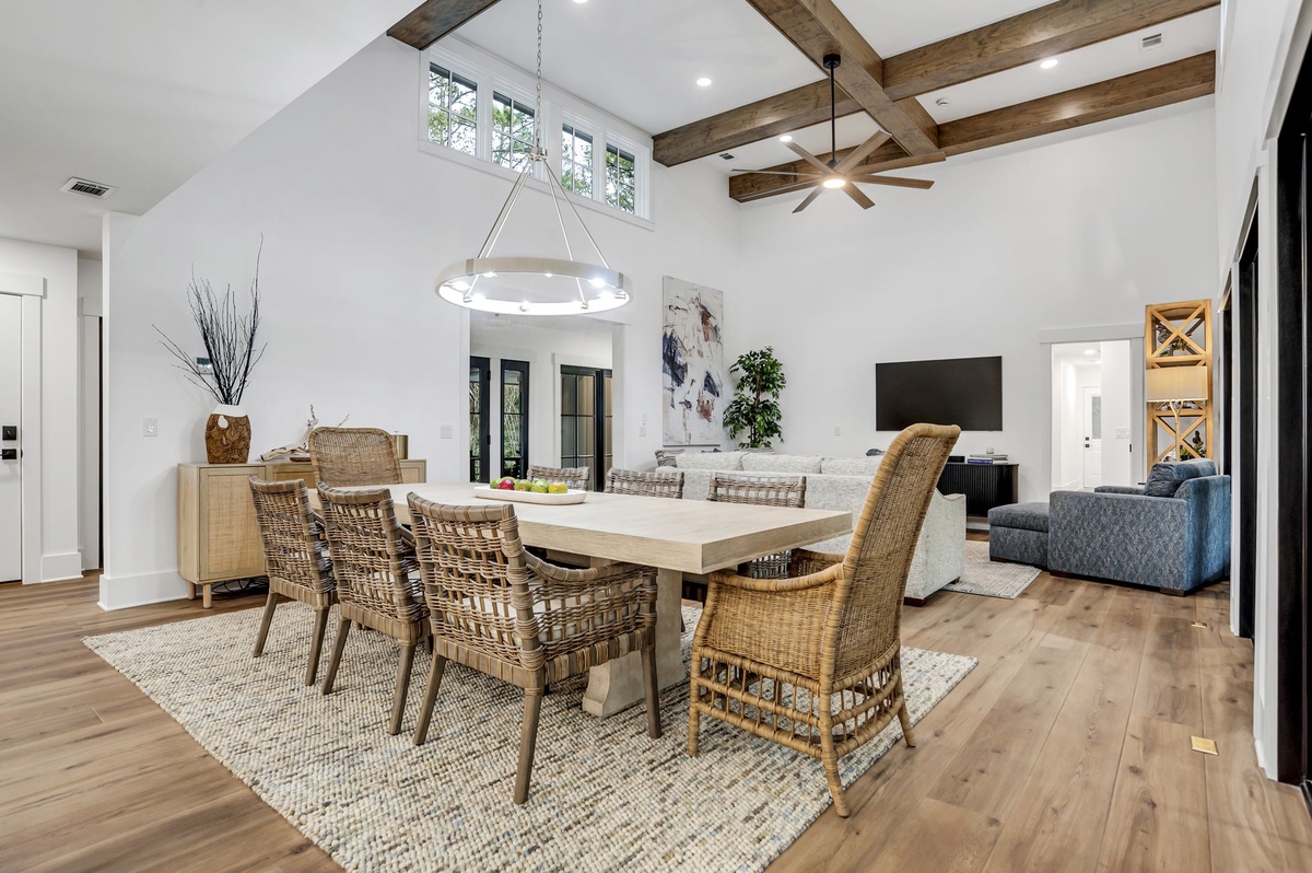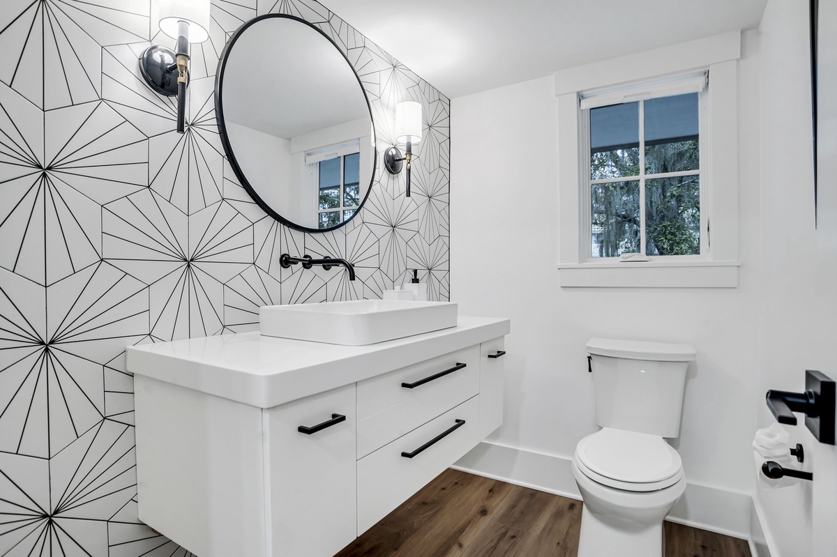 The dining room has a large wooden table with rattan chairs coupled with two overstuffed end chairs. There’s a powder room just off the main living space with a beautiful floating shelf sink that boasts a black and white formal look.