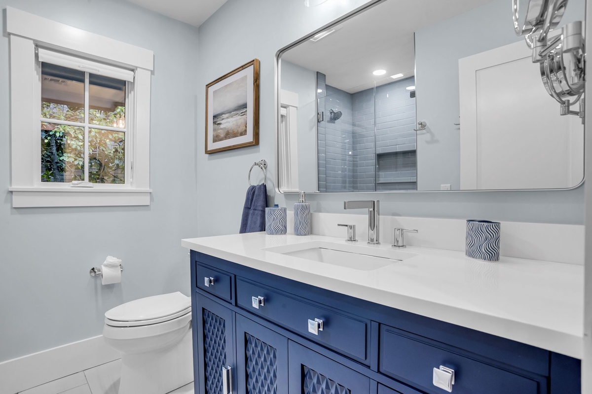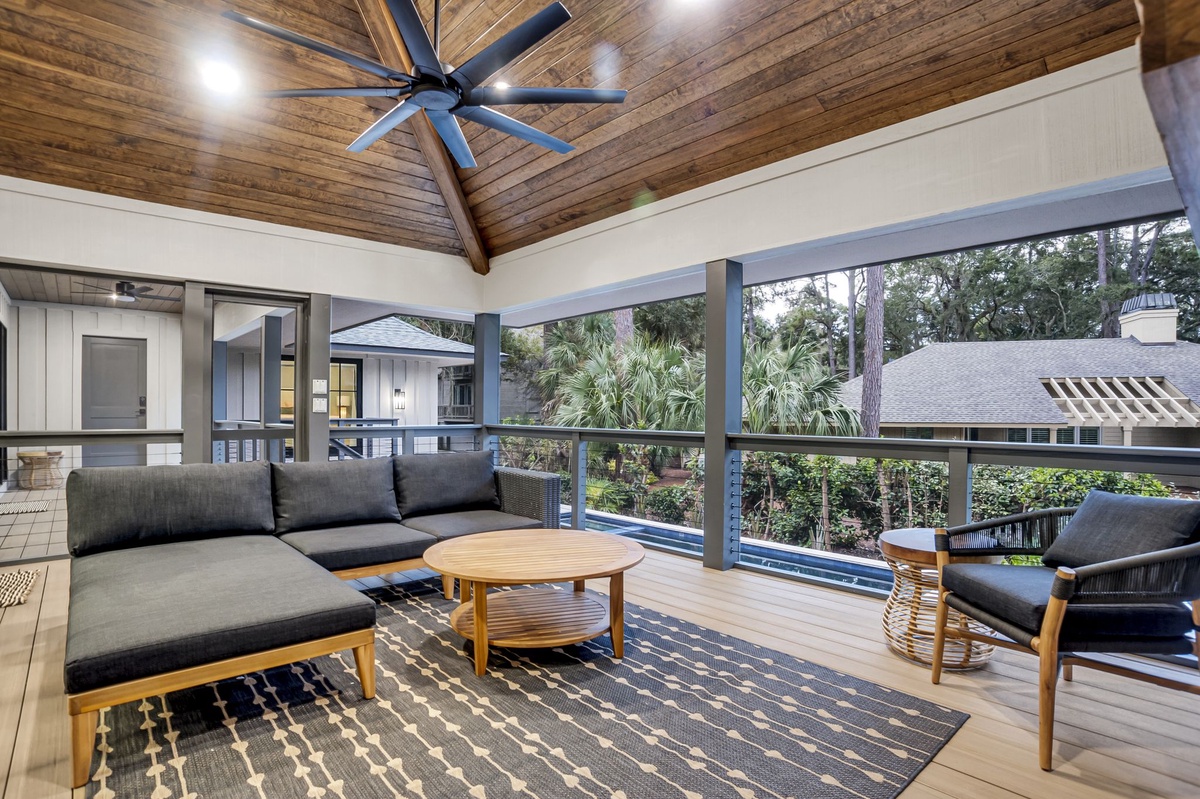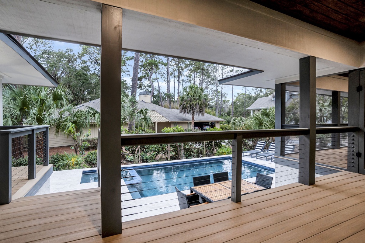 The main living room boasts a high ceiling with wood coffers. There’s an oversized 96” sofa with 2 swivel chairs, coupled with an overstuffed side chair and matching ottoman. All furniture surrounds a large wood coffee table centered on a beautiful fireplace with a lovely mantel to complete this modern look. The main living space also hosts a large flat screen TV. The rear wall of this comfortable living area allows for ample light through the full glass windows and doors which lead to a covered porch for the entire width of the rear of the house with stairs leading to the pool and hot tub. The architects thoughtfully designed an outside bathroom at this exterior level for guests coming in from the pool and/or beach.