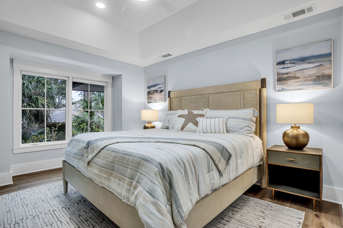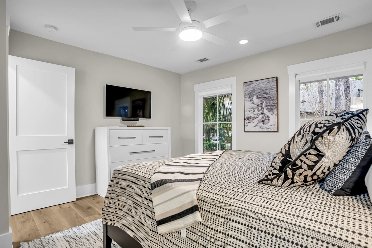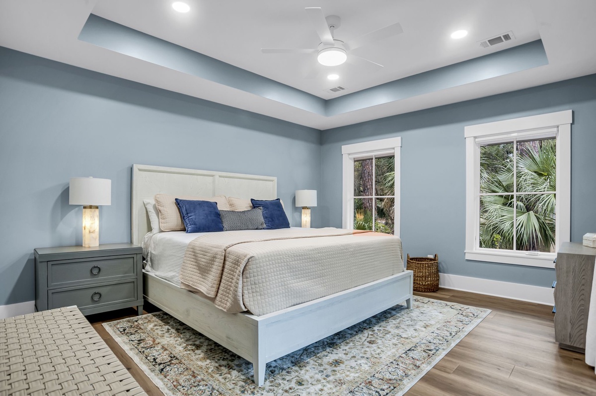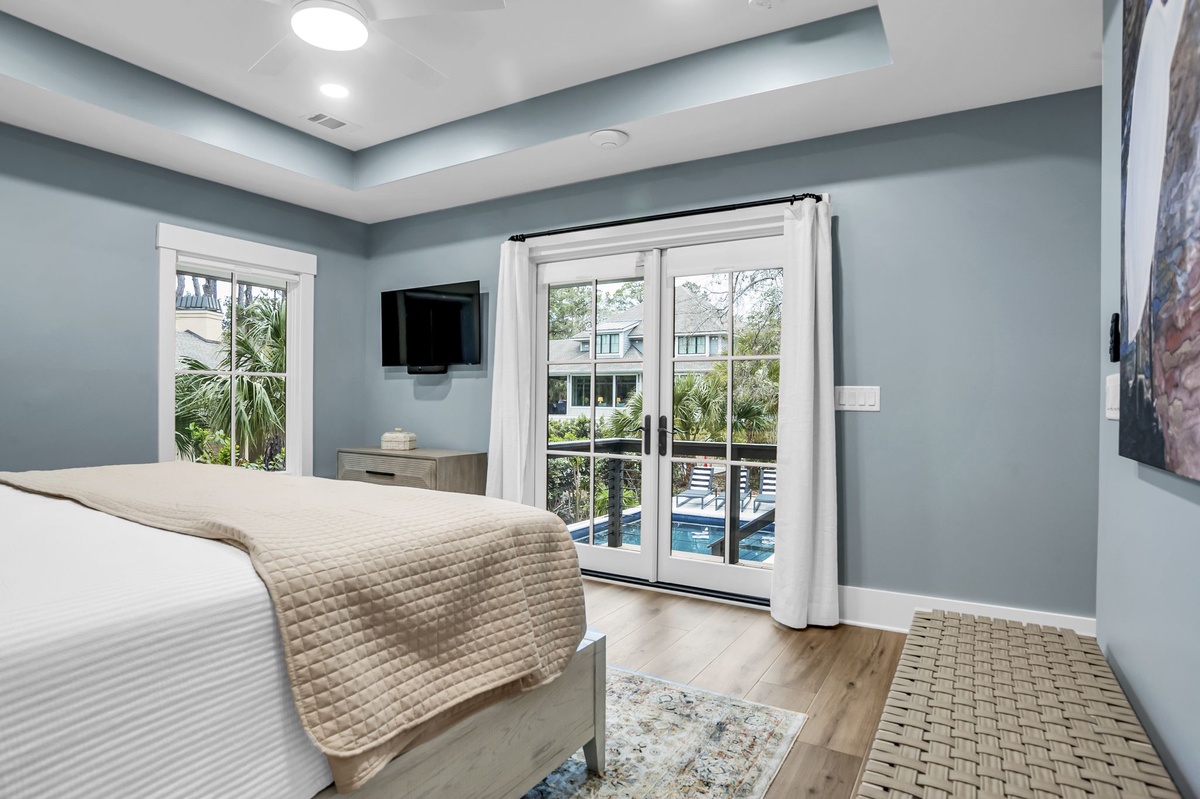 The master bedroom has double sliding doors that lead to the balcony connecting directly to the covered porch with access to the pool and hot tub.