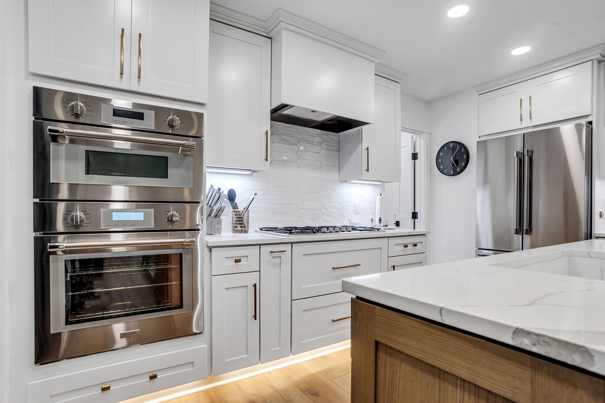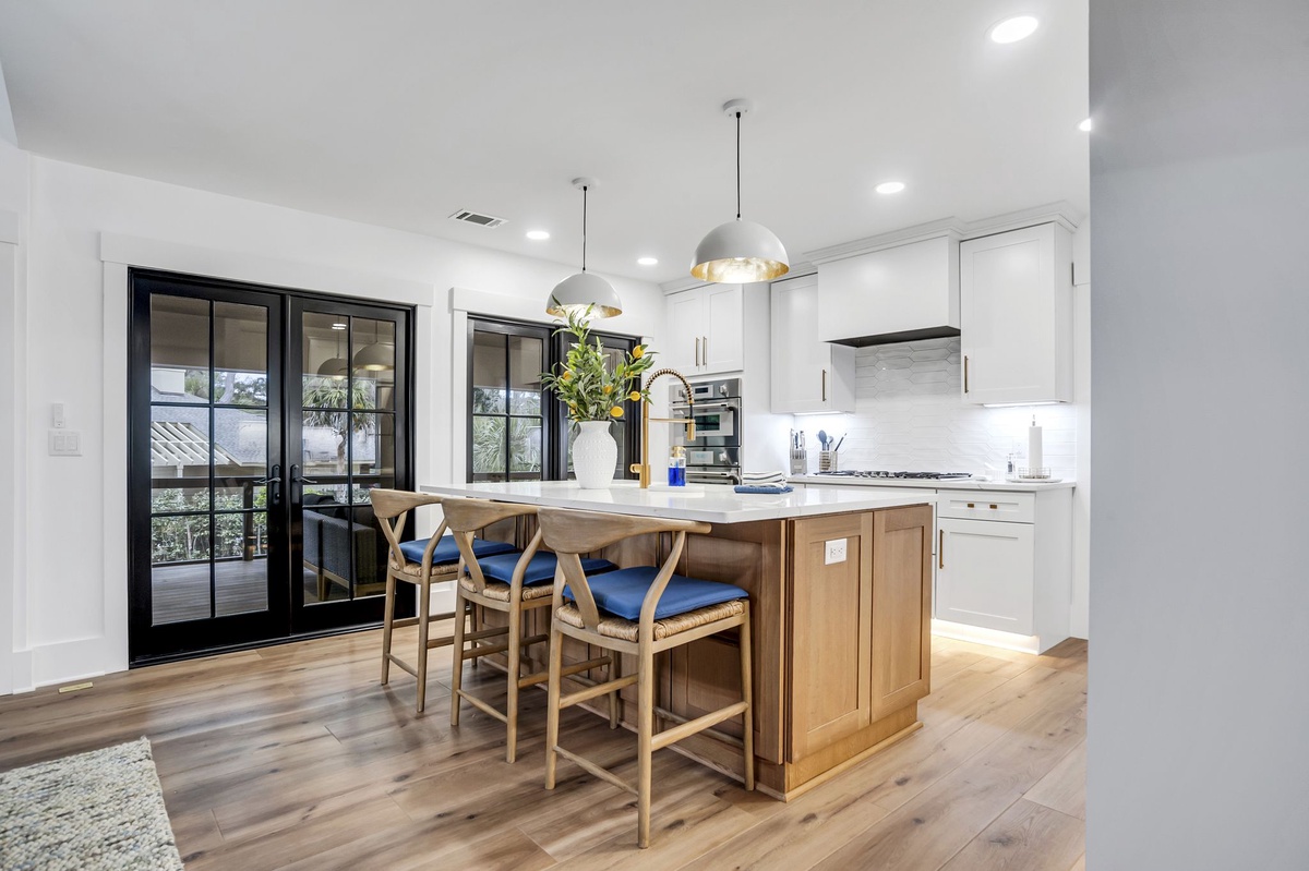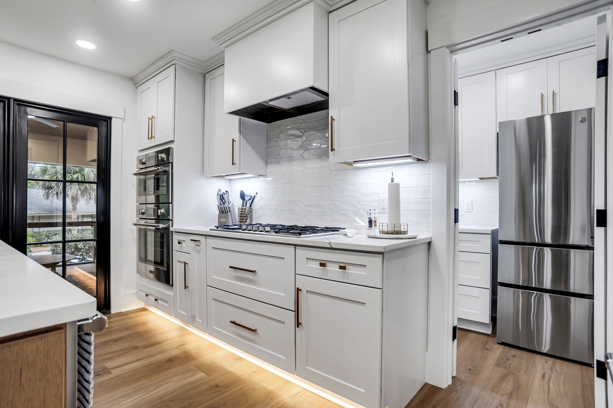 This generous open concept main living space leads you to the upscale kitchen, with white cabinets and clear white tilework, creating a cloud-like visual. All appliances are stainless steel, including a 6-burner stove and double oven. Enclosed on the back side of the kitchen is a Butler’s pantry, with an extra full-sized refrigerator. Bar stools are counter height to suit all ages.
