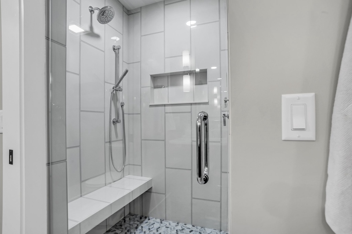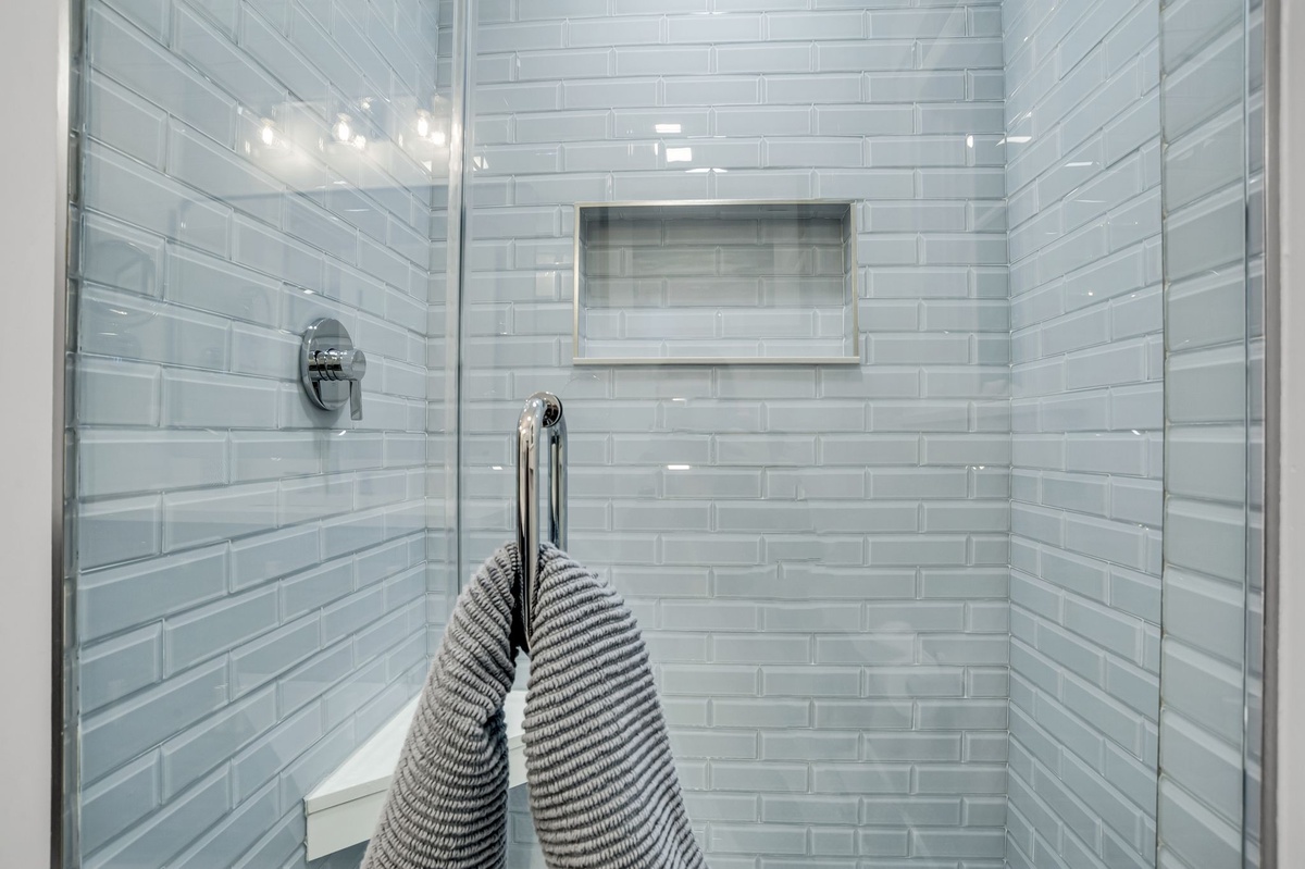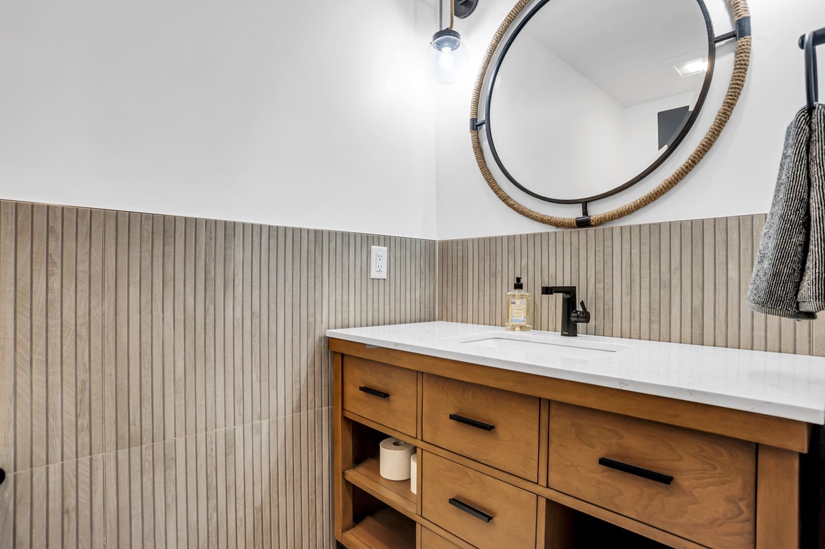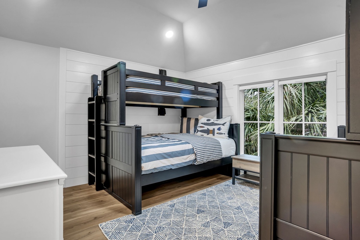 Directly off the kitchen are stairs leading up to an additional bedroom or bunkroom. This bedroom features two twin over full bunk beds set along shiplap covered walls. The bathroom has a walk-in shower themed in beige and linen tiles with a focus on neutrals: sand, grays and whites.