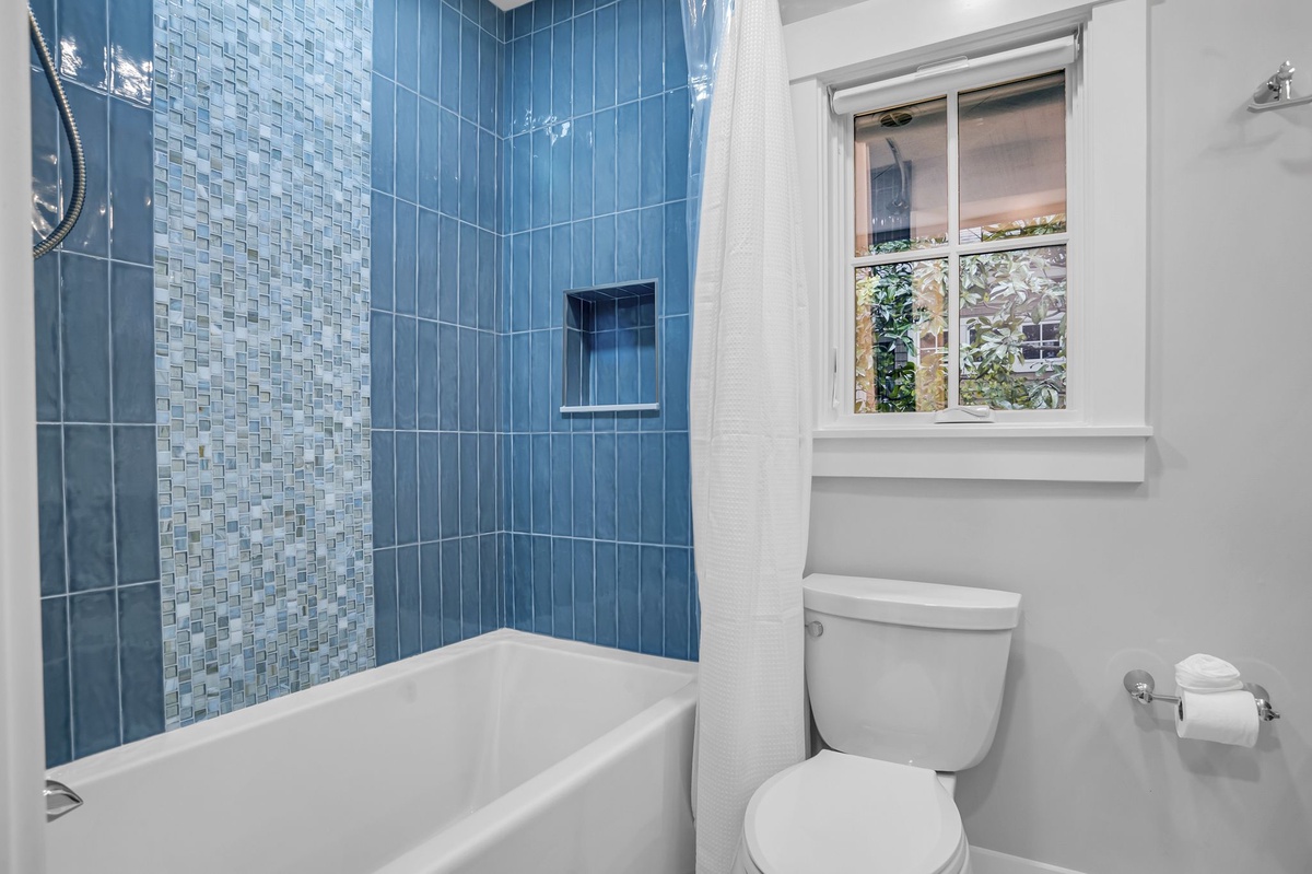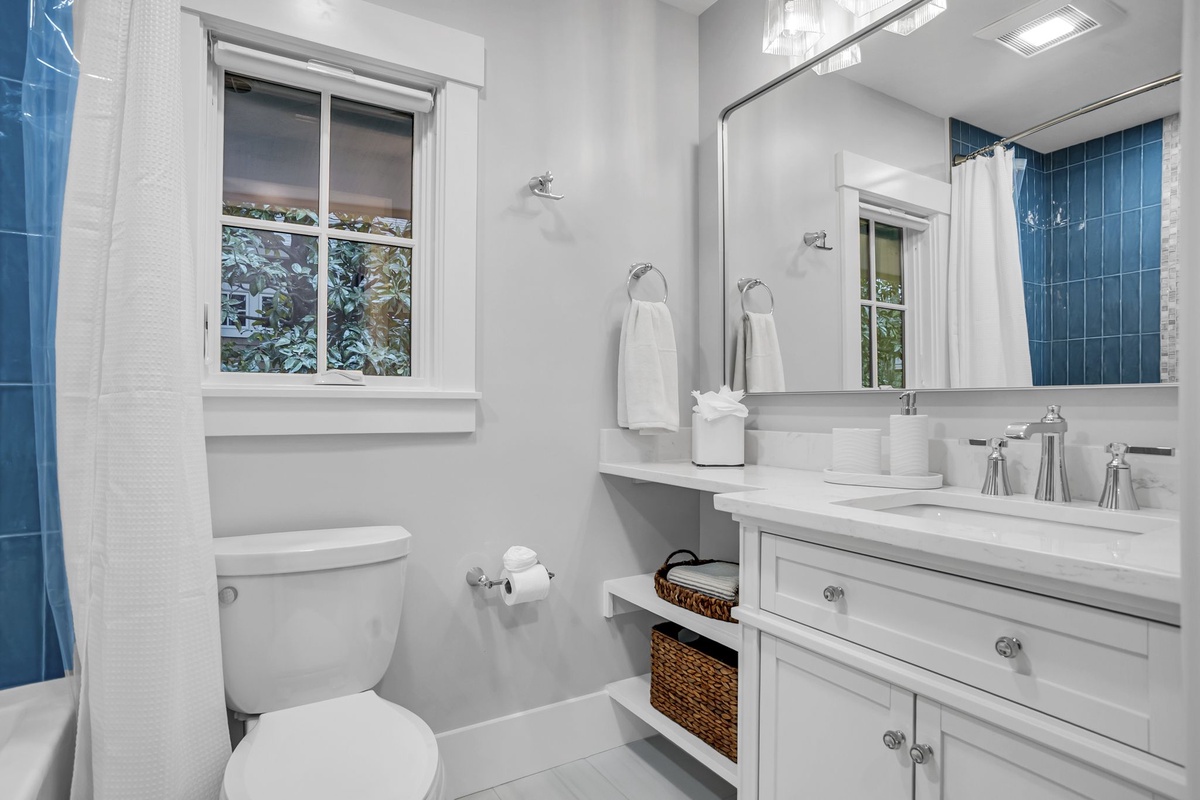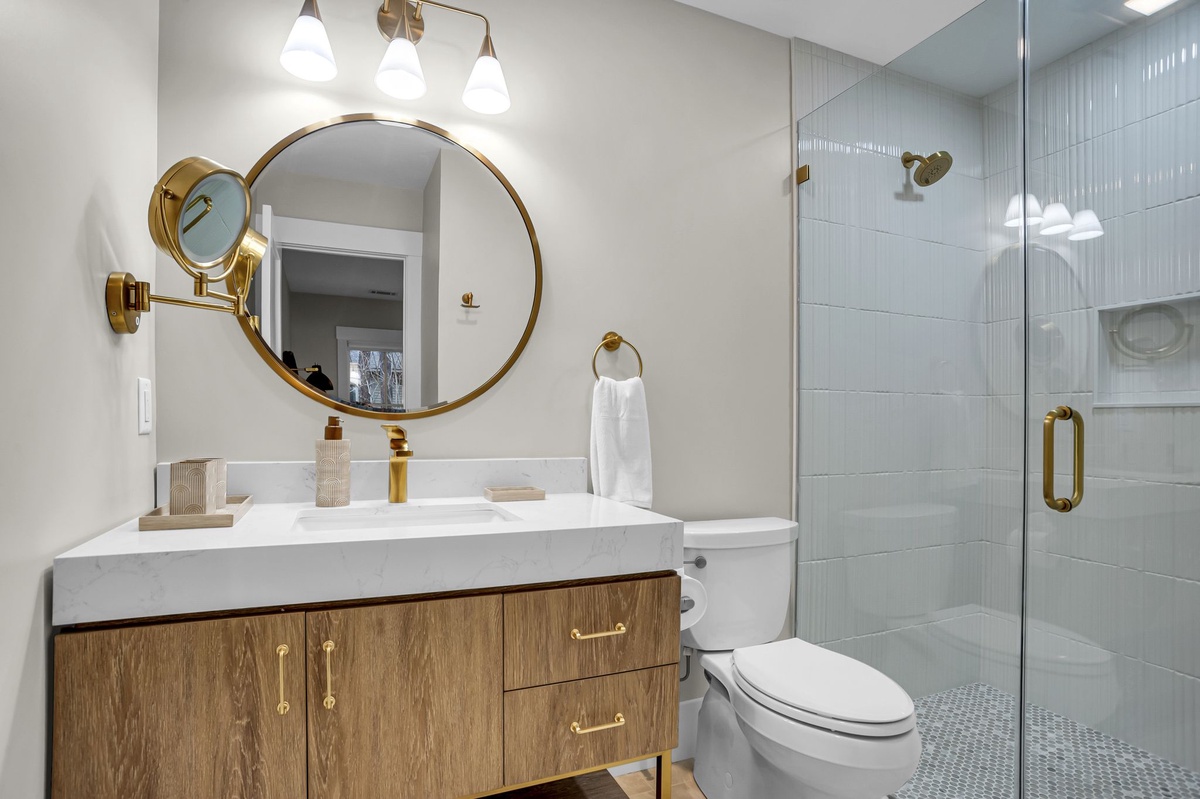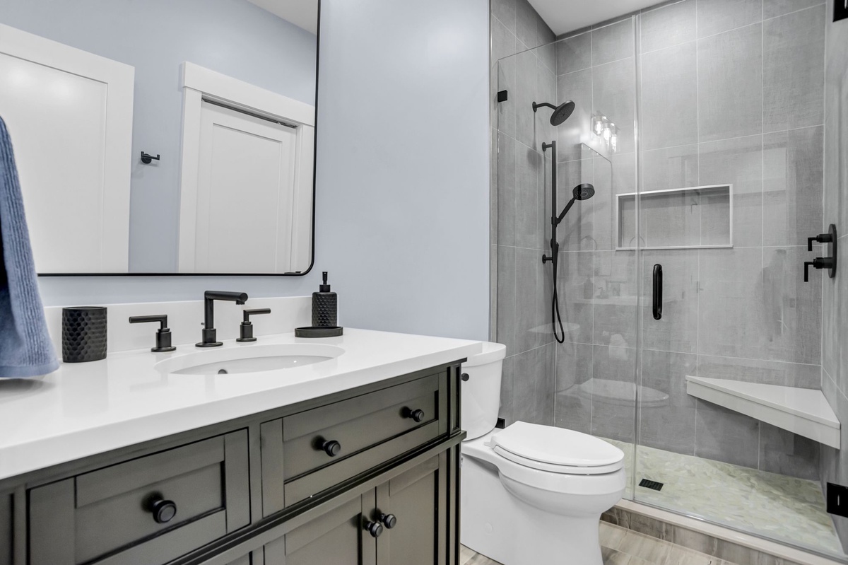Directly off the kitchen are stairs leading up to an additional bedroom or bunkroom. This bedroom features two twin over full bunk beds set along shiplap covered walls. The bathroom has a walk-in shower themed in beige and linen tiles with a focus on neutrals: sand, grays and whites.