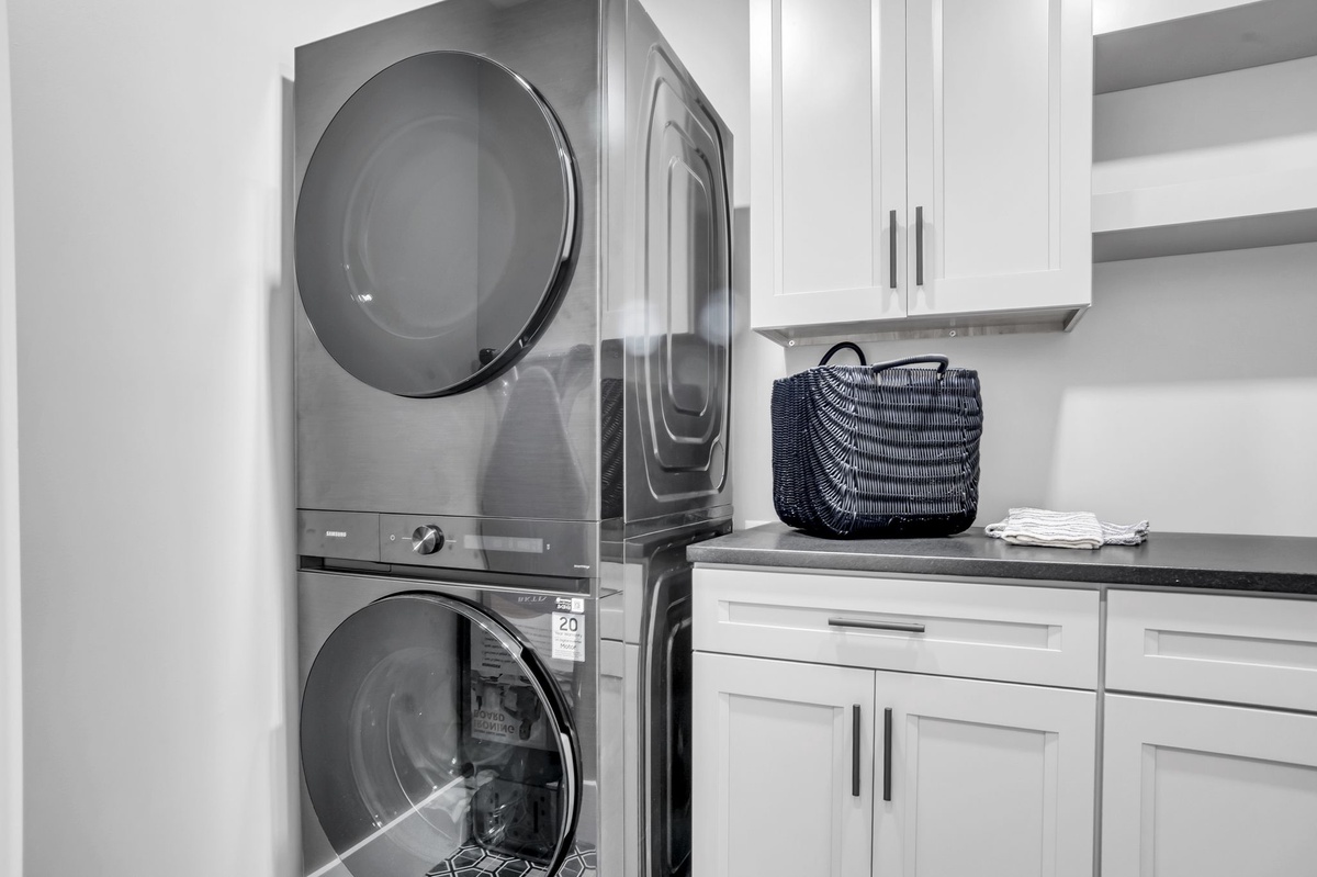 The center hallway near the 4 bedrooms has back door access with stairs leading to the beach path. A mudroom area with bench and hooks is located in the center hallway to allow easy access for beach supplies and towels after a long day on the beach. The laundry room with stackable washer and dryer is also located in the center hallway for easy access for all guests.