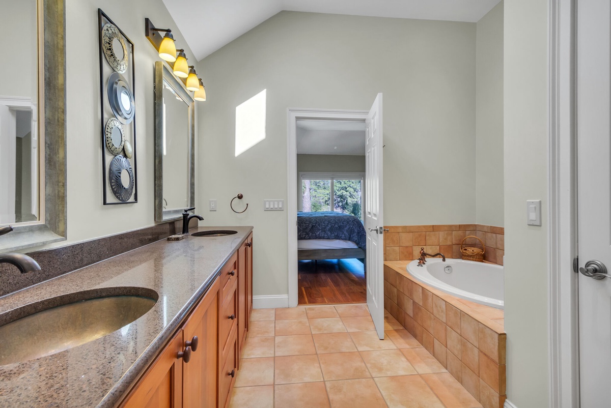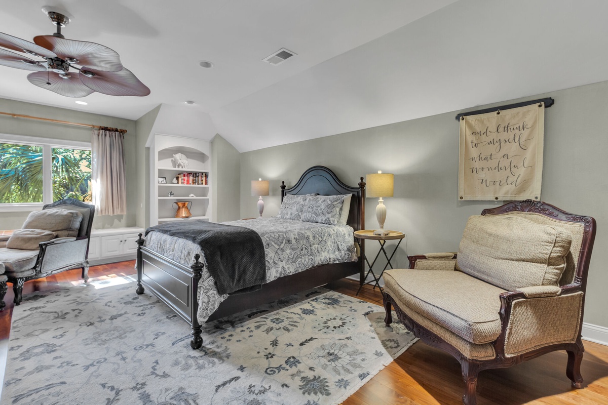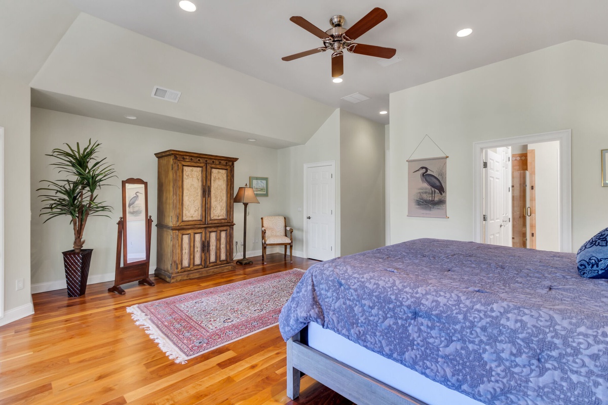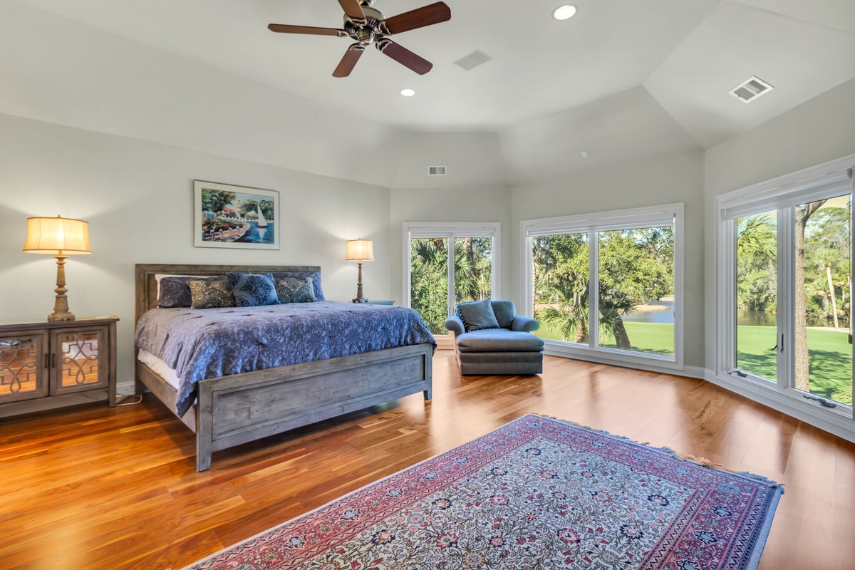The main 1st floor bedroom lies at the far end of the property, enjoying blissful privacy through an extended hallway entrance. Here, a king-size bed commands stunning golf views in a luxurious suite with flat-screen TV and spa-like en suite bath. You can soak in the corner tub or destress in the cavernous walk-in shower amid tranquil and sophisticated surrounds.