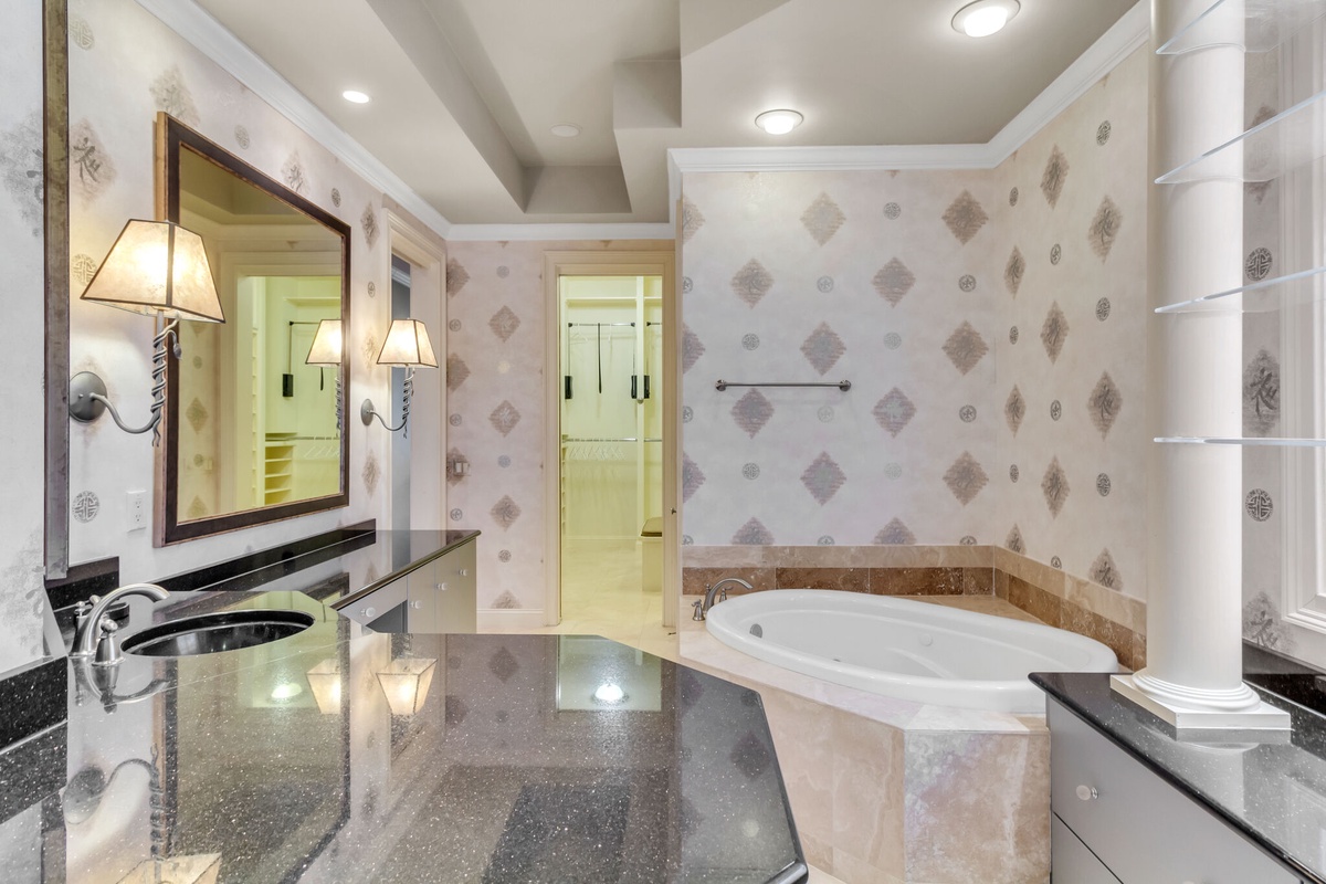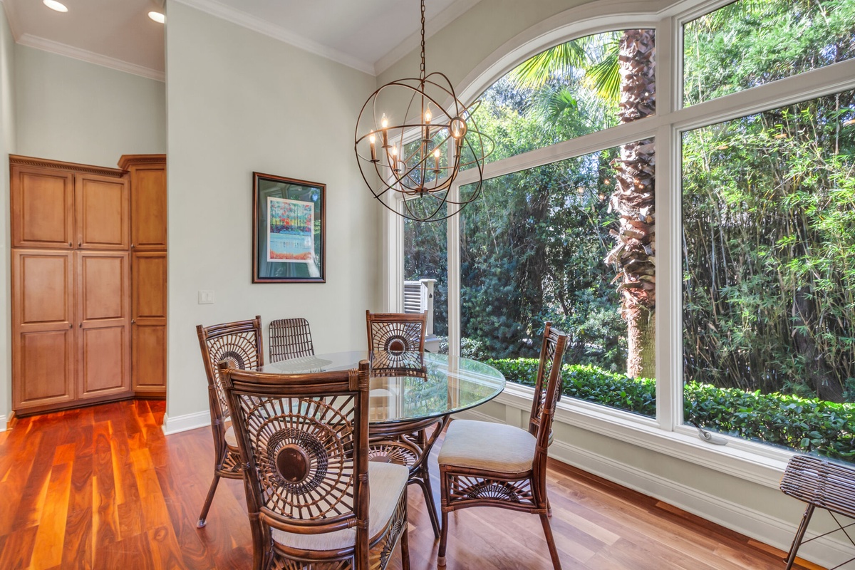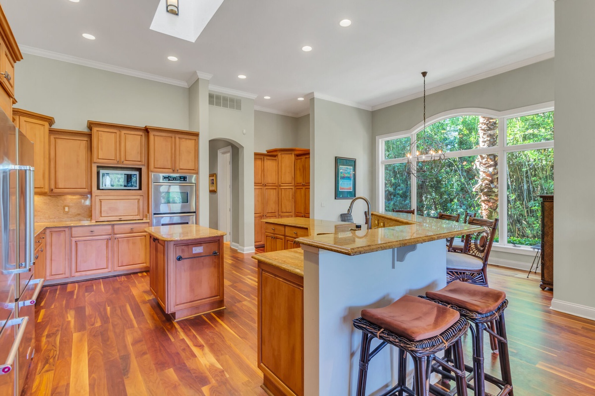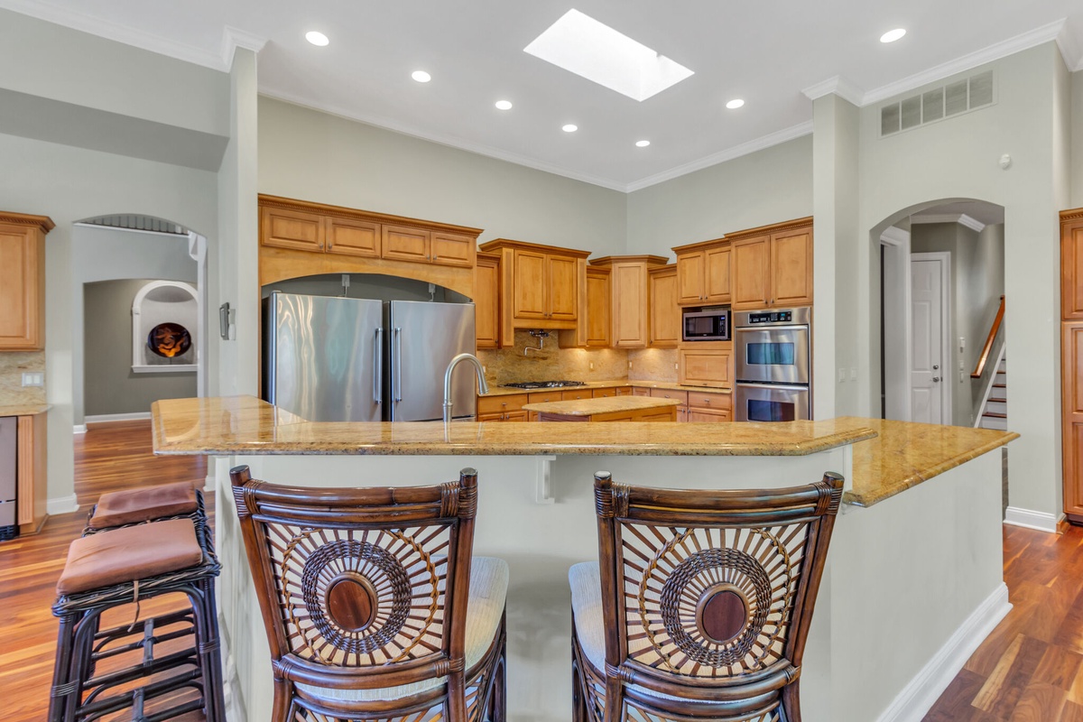 Keep the festivities lively in the open floor plan living room and kitchen, just on the other side of the fireplace wall. Here you’ll find everything you need for entertaining – a full bar with wine cooler and ice maker, as well as an expansive gourmet kitchen. Spacious and updated, the wraparound granite counters, separate island and double refrigerators give you plenty of space to work with, crafting delicious meals on the chef-style range with pot filler. Take your meals either in the formal dining room with its tall ceiling and seating for ten, or at the breakfast nook with seating for six, or at the counter with seating for four.