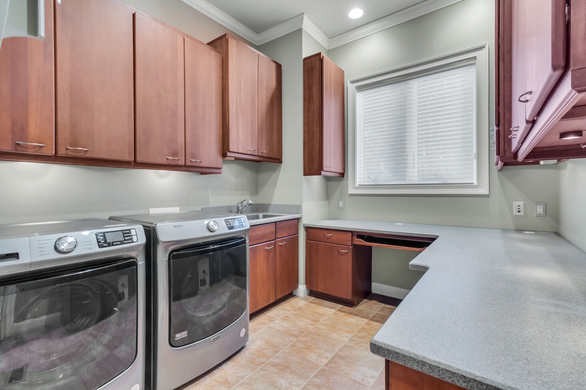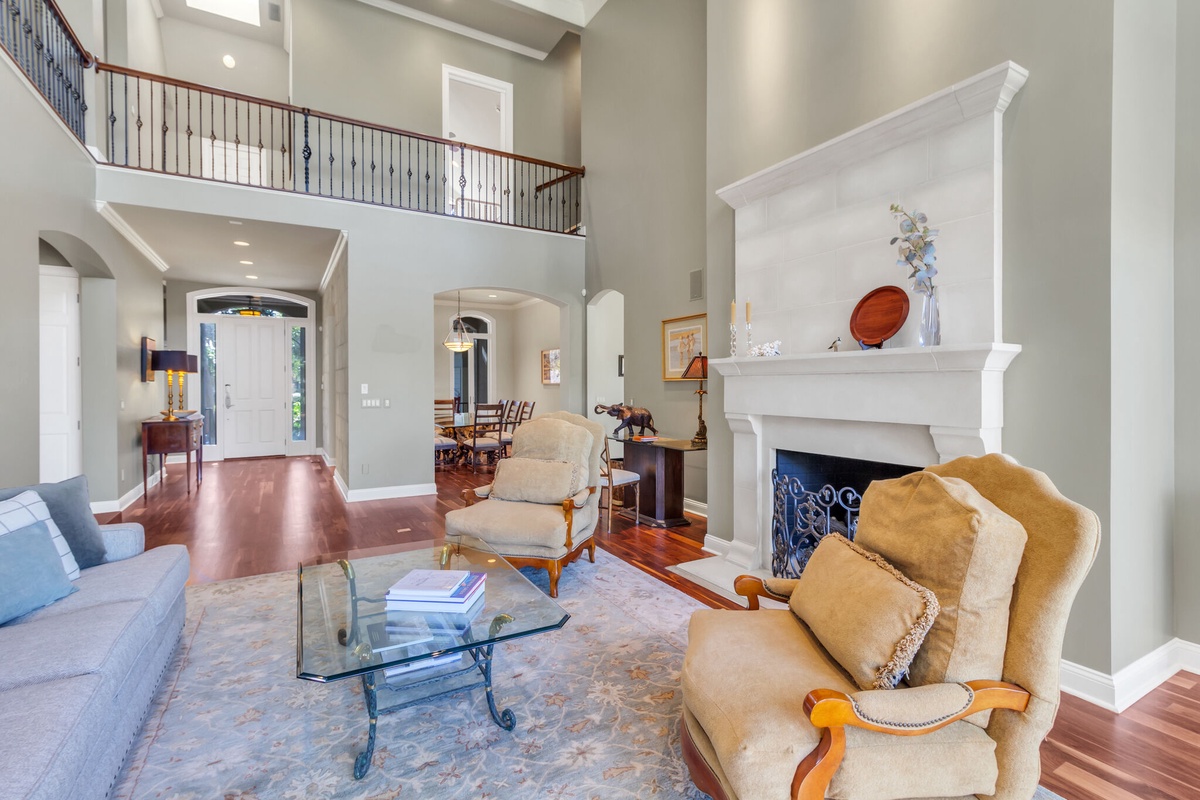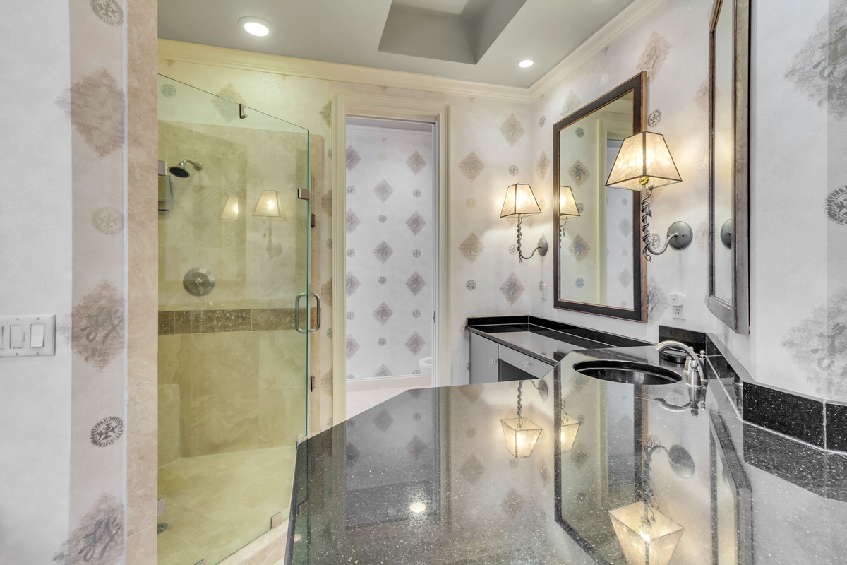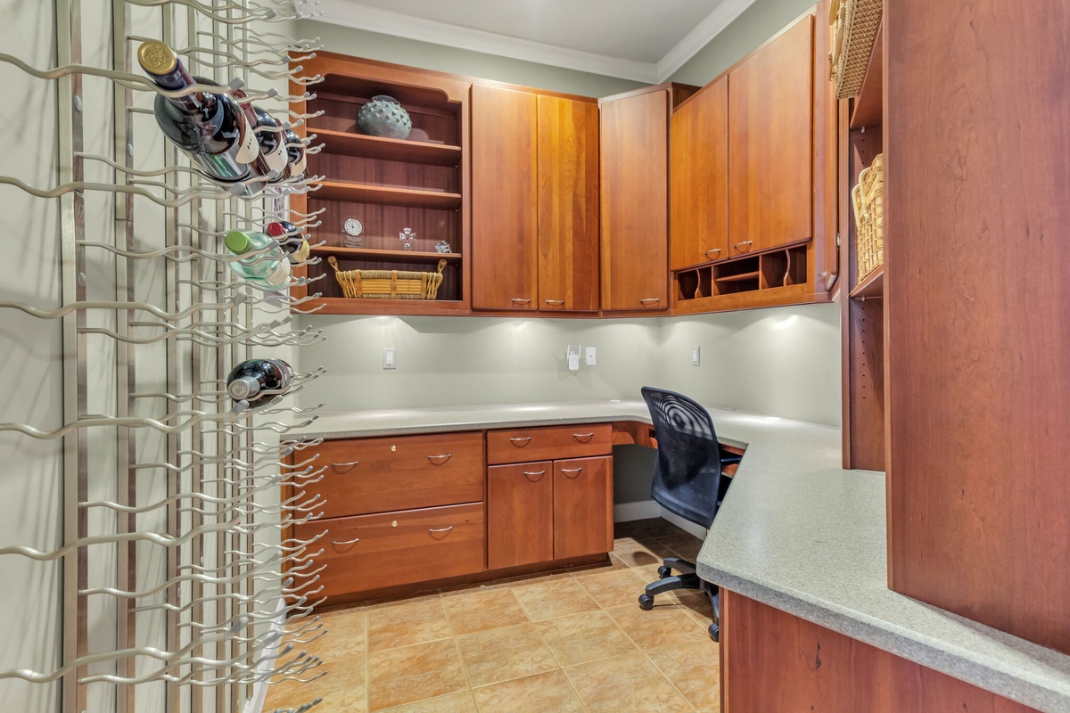 Keep the festivities lively in the open floor plan living room and kitchen, just on the other side of the fireplace wall. Here you’ll find everything you need for entertaining – a full bar with wine cooler and ice maker, as well as an expansive gourmet kitchen. Spacious and updated, the wraparound granite counters, separate island and double refrigerators give you plenty of space to work with, crafting delicious meals on the chef-style range with pot filler. Take your meals either in the formal dining room with its tall ceiling and seating for ten, or at the breakfast nook with seating for six, or at the counter with seating for four.