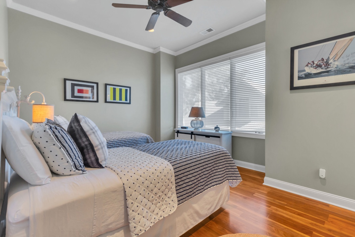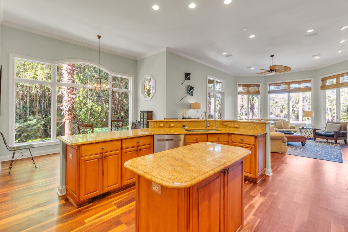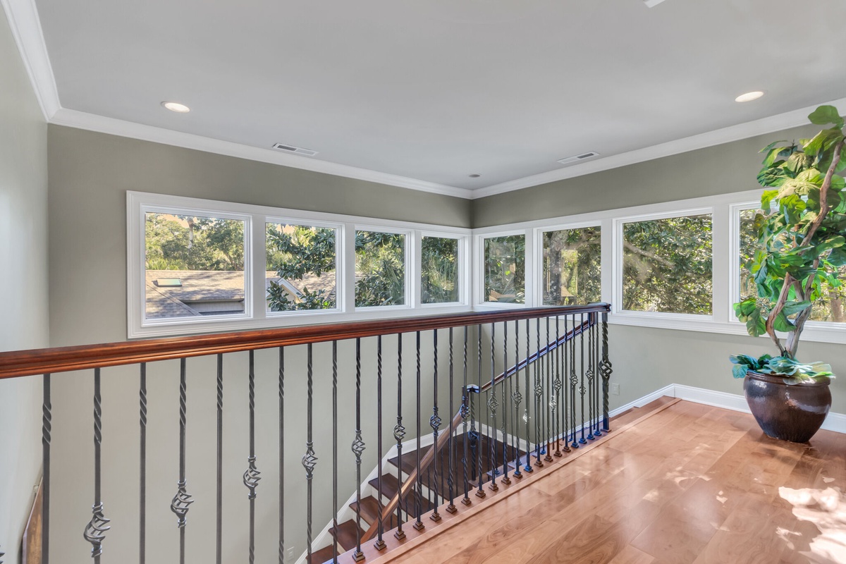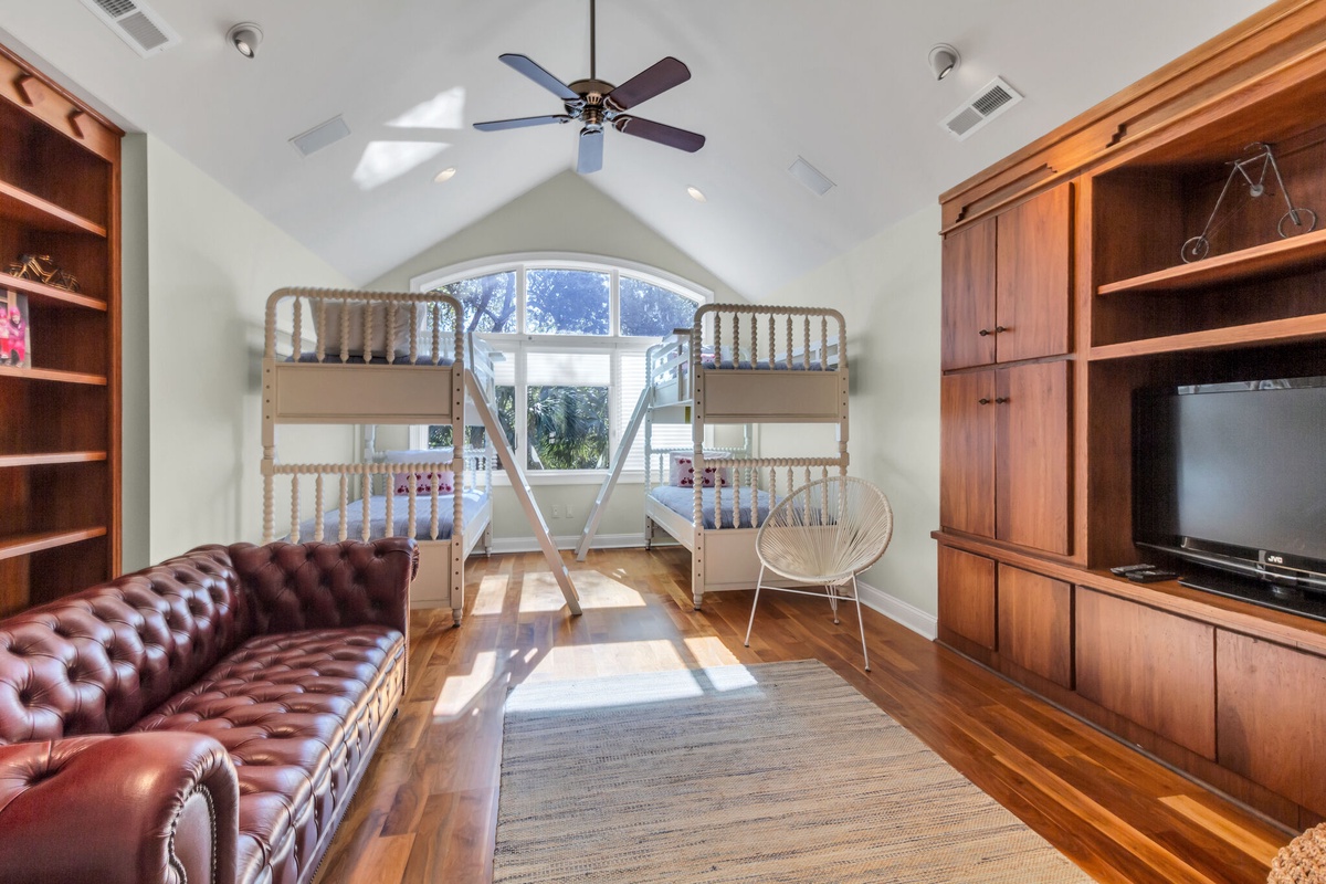The remaining guest rooms are all on the second floor, arrayed around a wide walkway overlooking the great room. In the first, you’ll find a queen bed set amid panoramic elevated golf views in a space with spacious closets and en suite boasting tub, shower and skylight. The second bedroom pairs two twin beds in a space redolent with nautical décor and enjoying its own en suite with tub and shower.