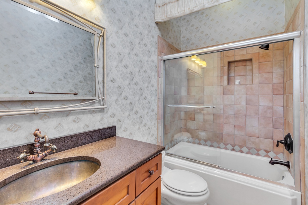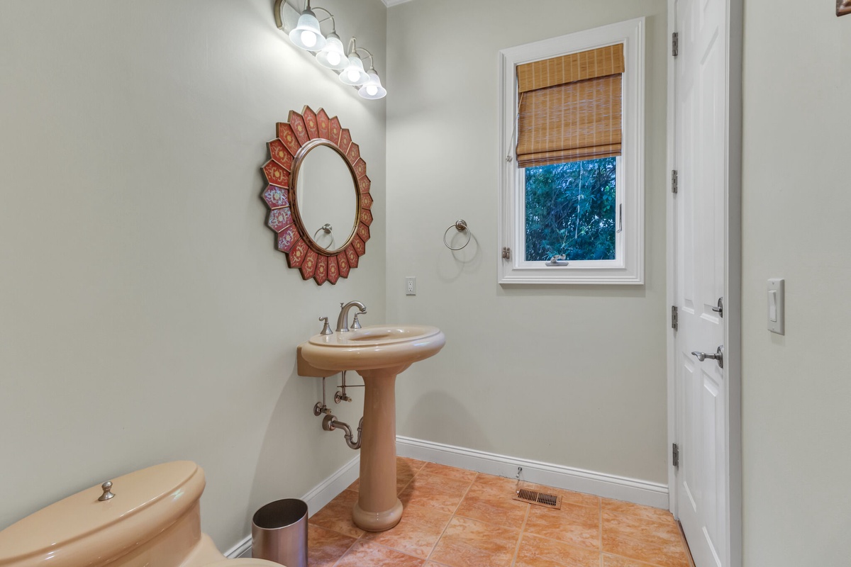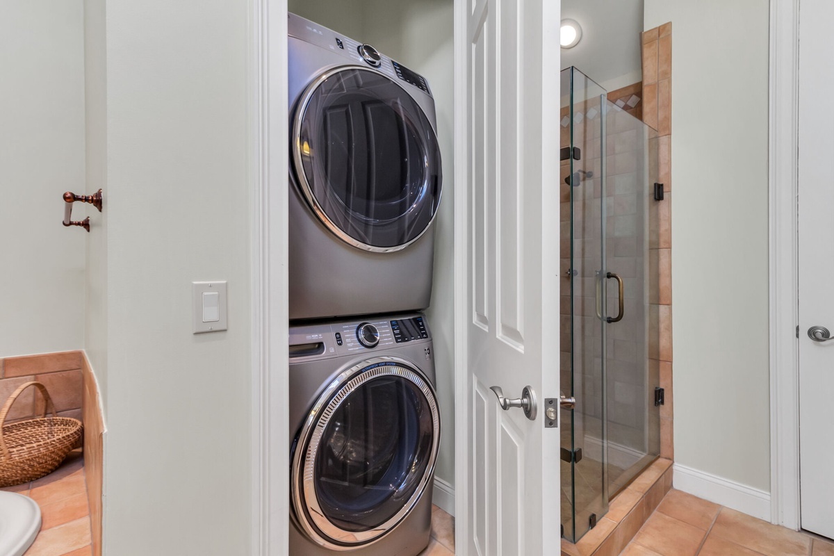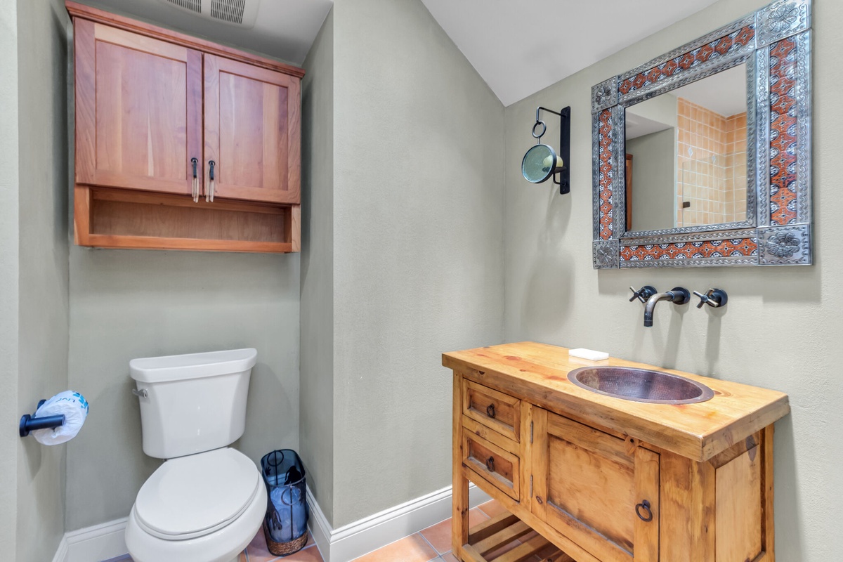 In addition to two half baths, the first floor offers up a pair of magnificent guest suites. In one, accessed just past the wine cellar and laundry room, you’ll find a plush queen-size bed amid custom-crafted built-ins, with the en suite bath offering walk-in shower and eye-catching hammered copper basin.