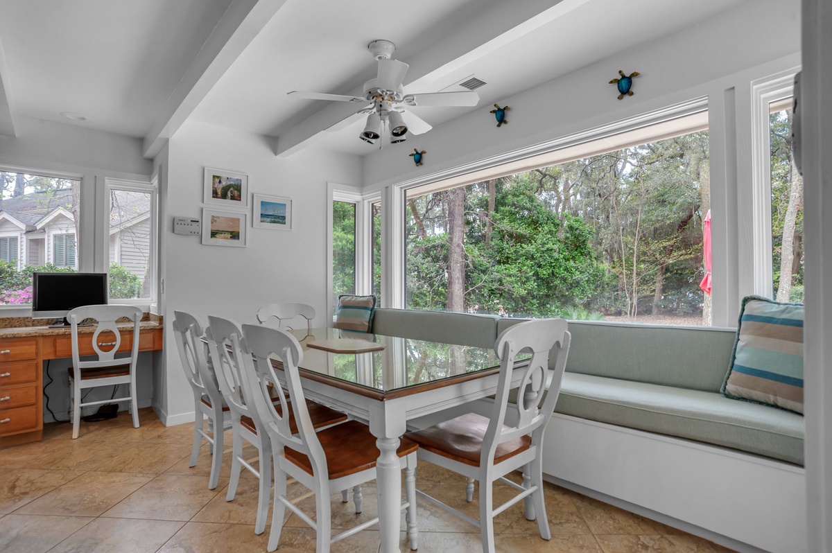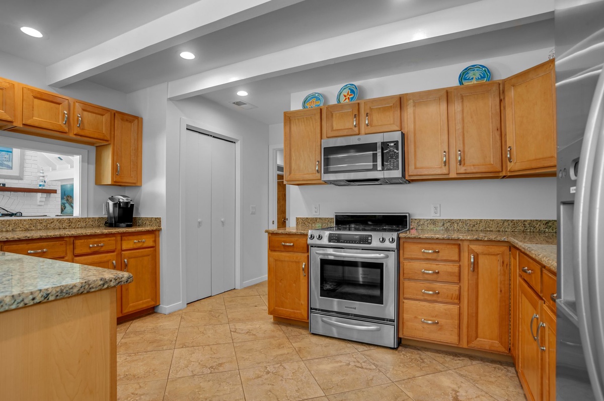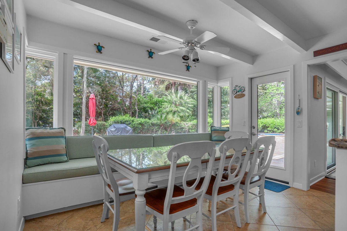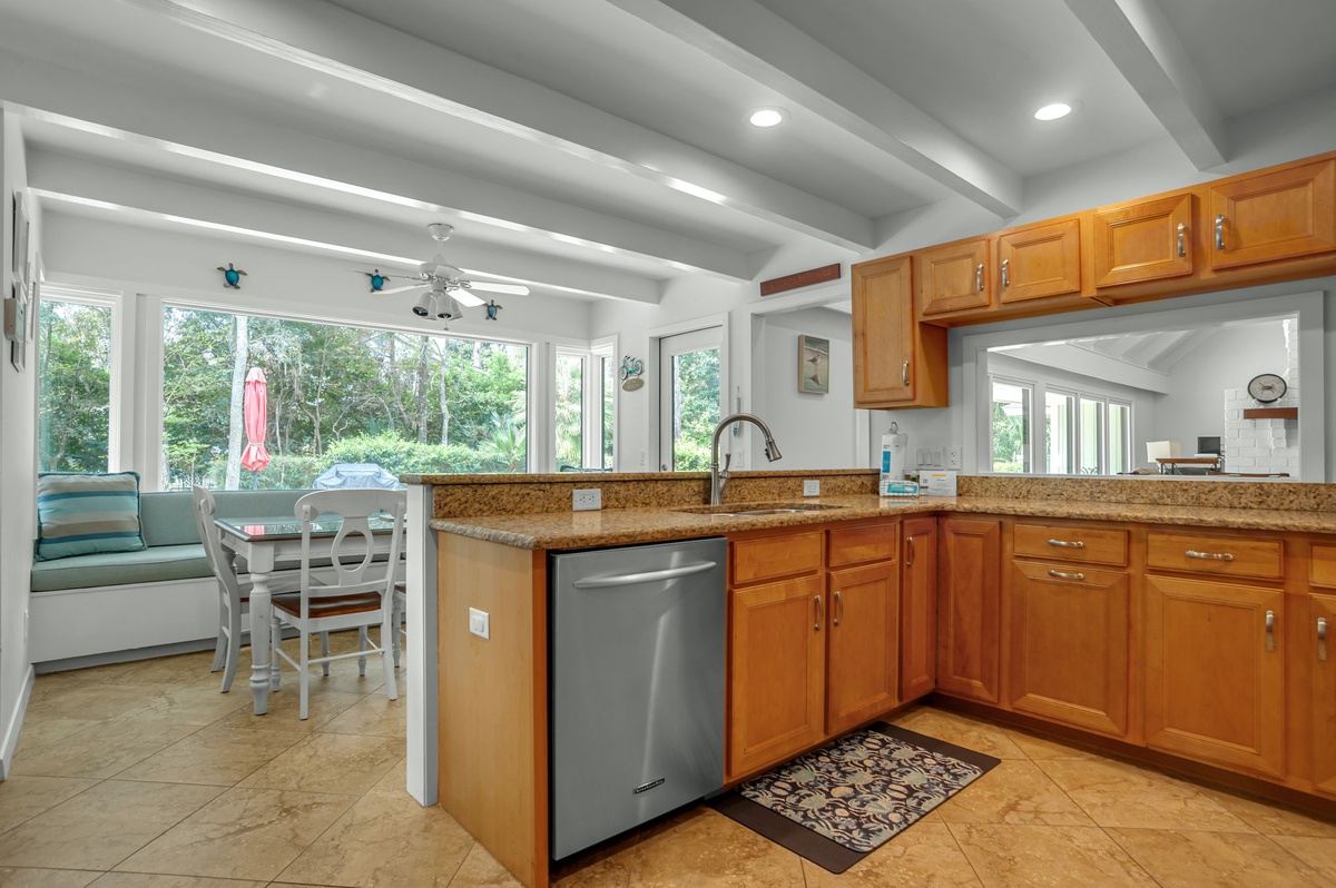 The updated kitchen has stainless steel appliances, granite countertops and a breakfast room with seating for 8. The breakfast room has lots of windows with a view of the pool. A door from the breakfast room opens onto the pool deck.