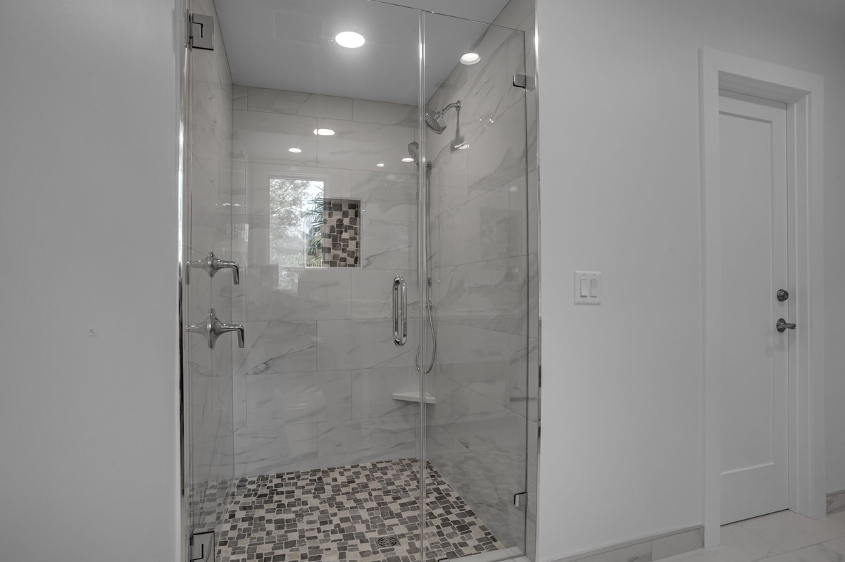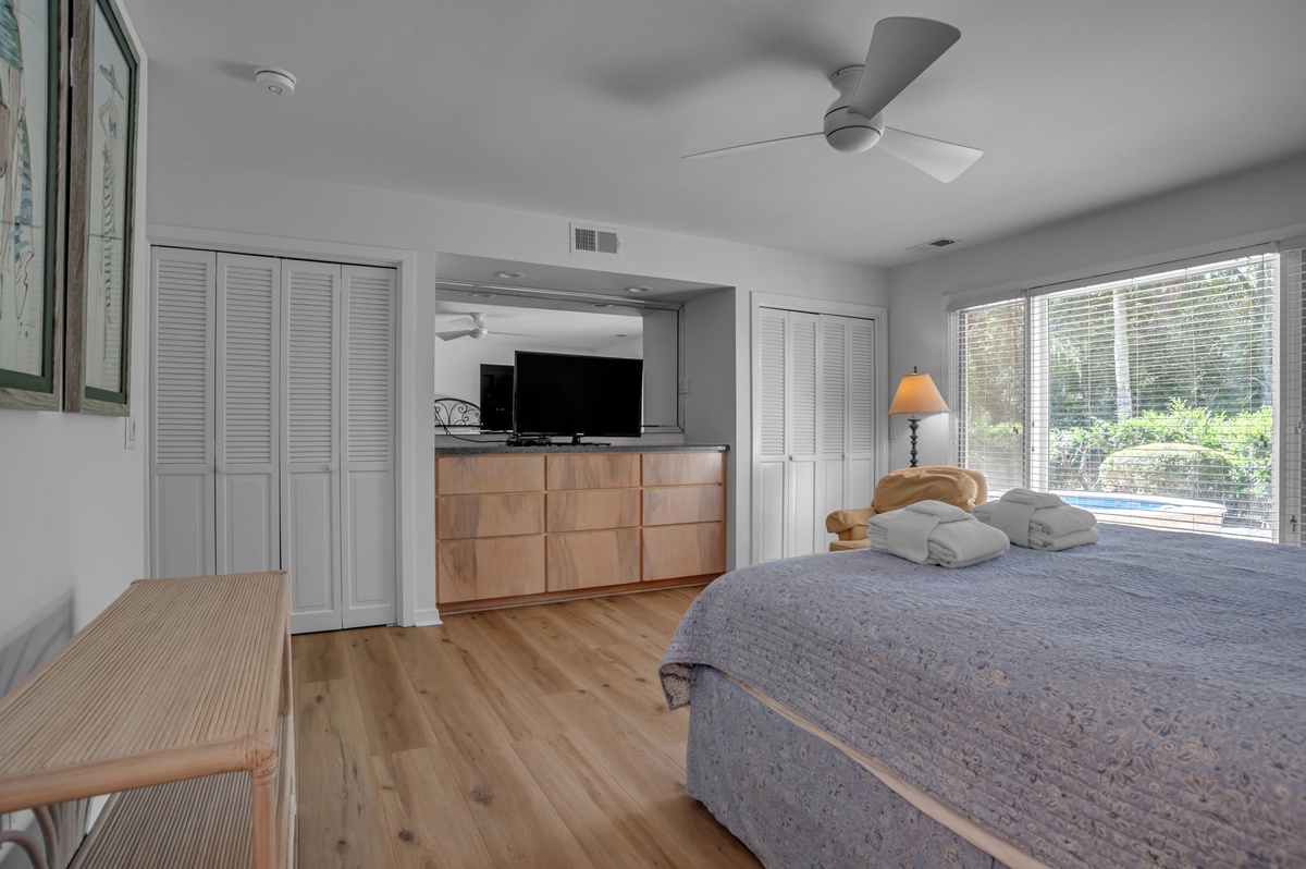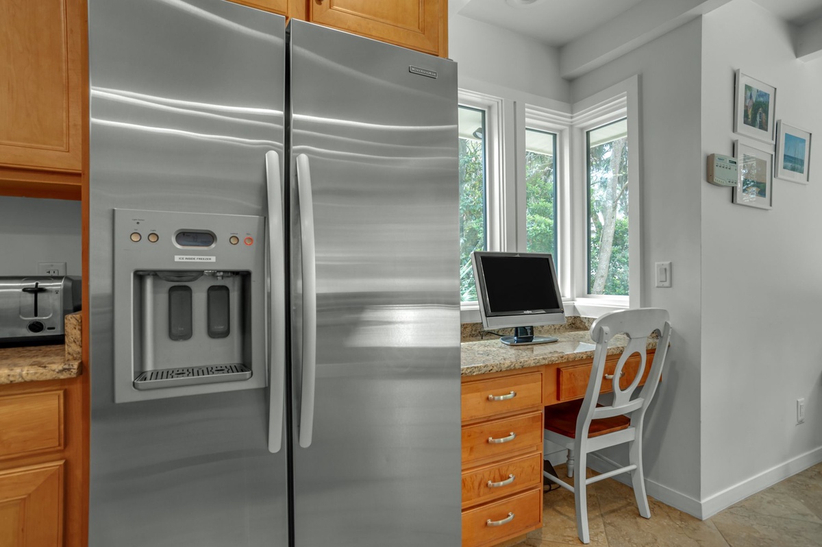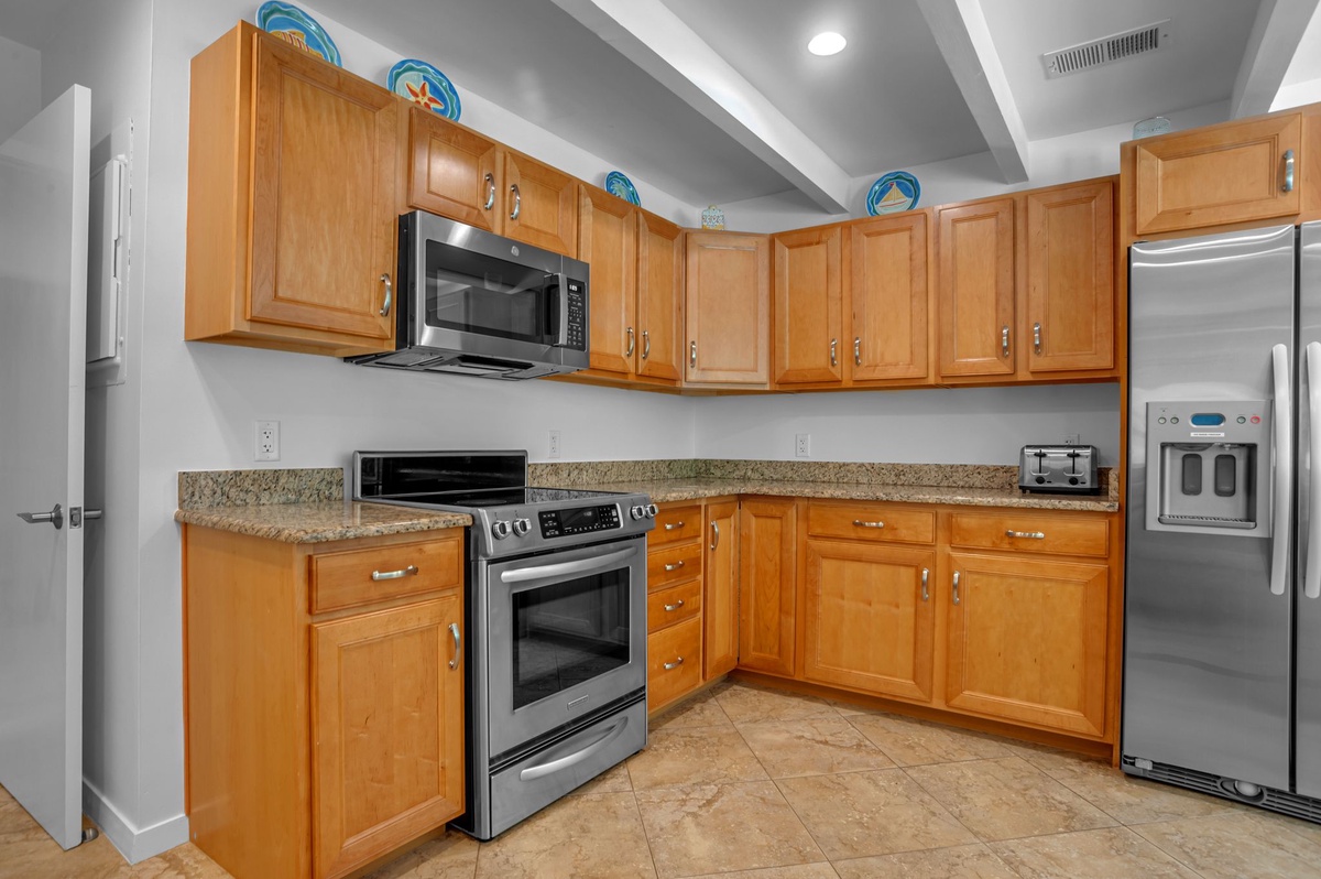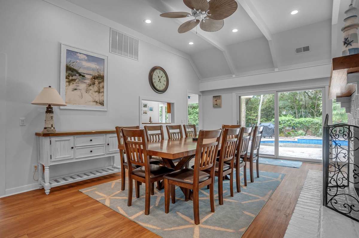 The updated kitchen has stainless steel appliances, granite countertops and a breakfast room with seating for 8. The breakfast room has lots of windows with a view of the pool. A door from the breakfast room opens onto the pool deck.