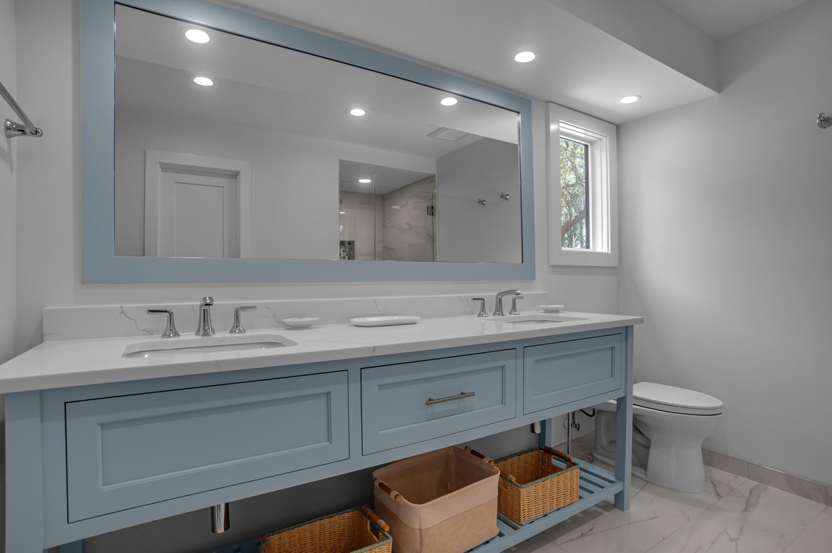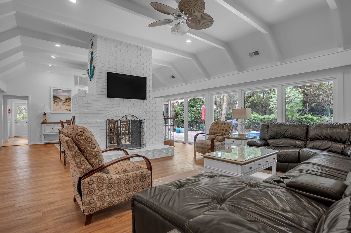 This home has an airy living room with an over-sized leather sectional and a large wall-mounted flat screen TV. A see-through fireplace separates the living room from the dining room, with a dining room table that seats 10.