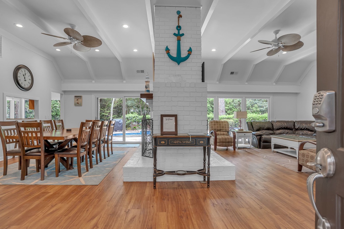 This 6-bedroom home is located on the walkway to the beach, just five rows away from the ocean, and it is the perfect retreat for a large family or group of friends.