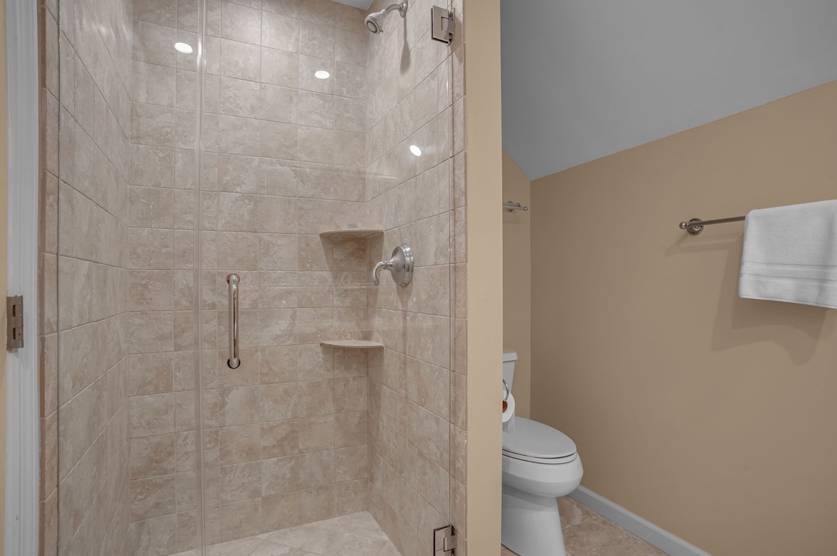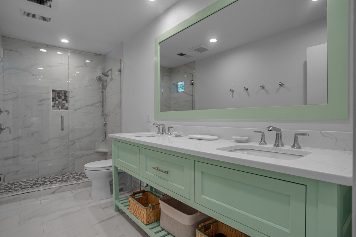 There are 6 bedrooms in total. Downstairs has 4 bedrooms and 3 baths. Three bedrooms have a king-sized bed and one has two double beds. Upstairs are 2 bedrooms, both with twin beds, and a shared bathroom with double vanity and shower. All bedrooms have flat-screen TVs.