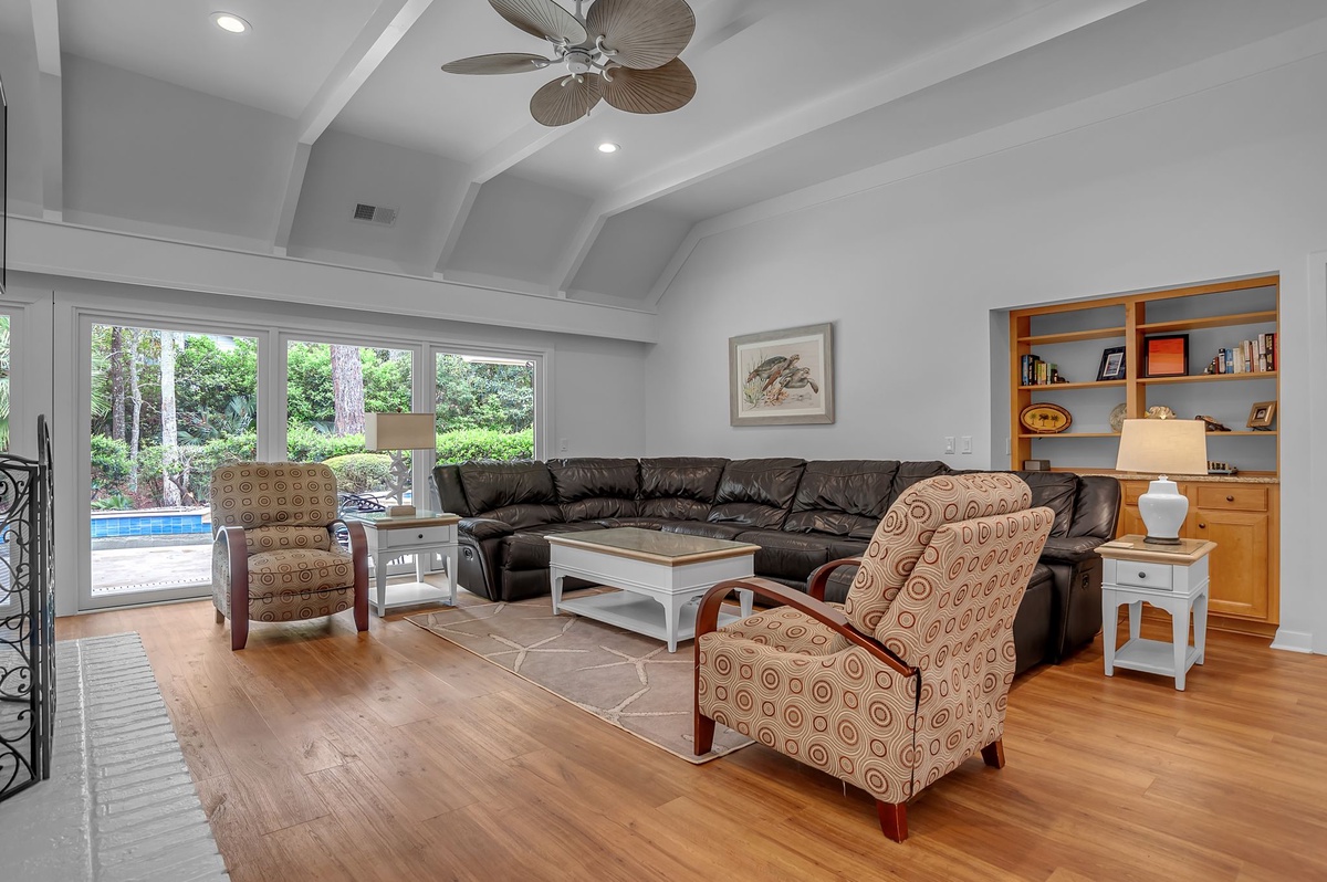 There is a wall of windows and sliding glass doors across the living room and dining room looking out onto the pool and spa.